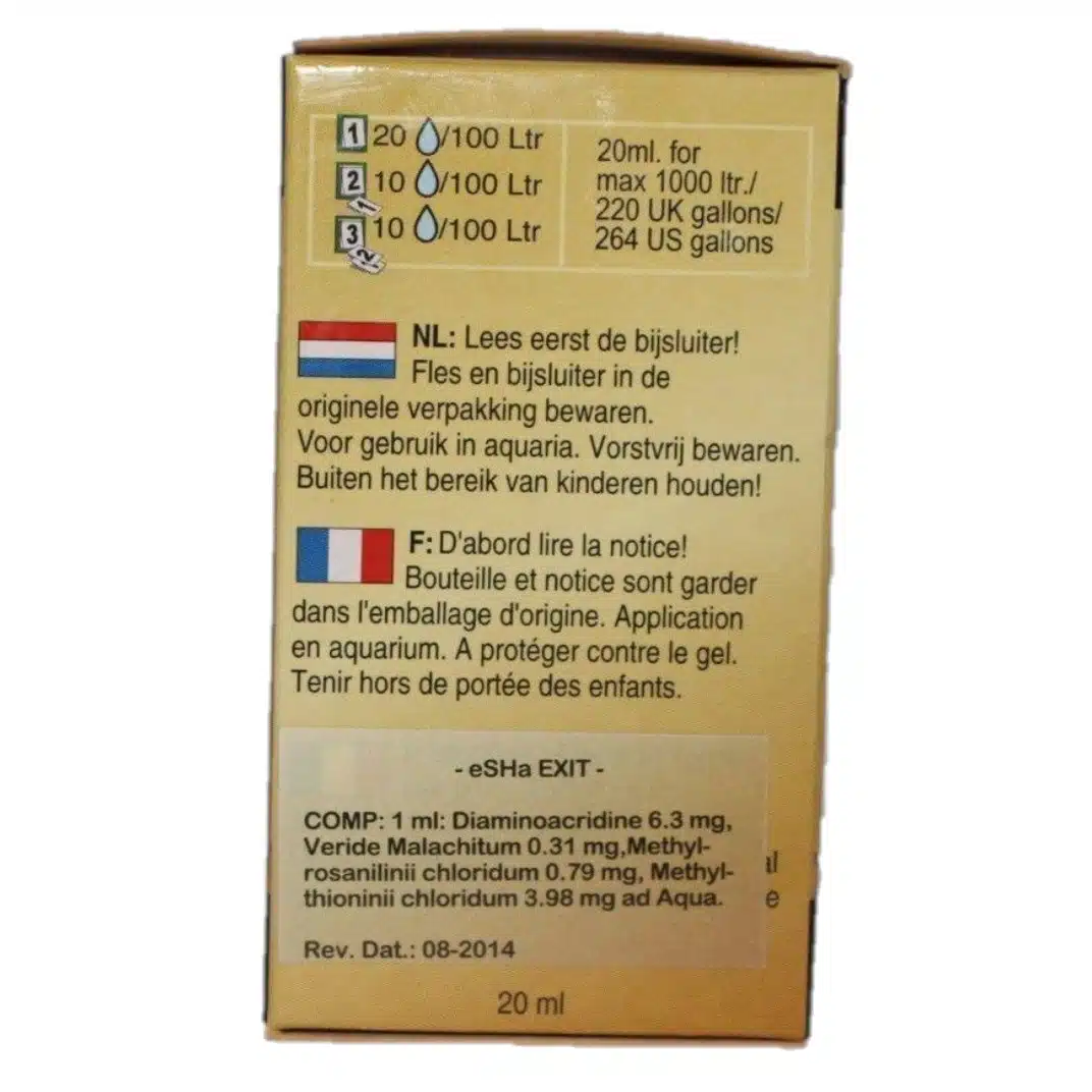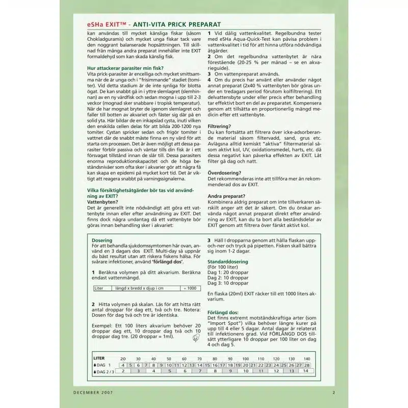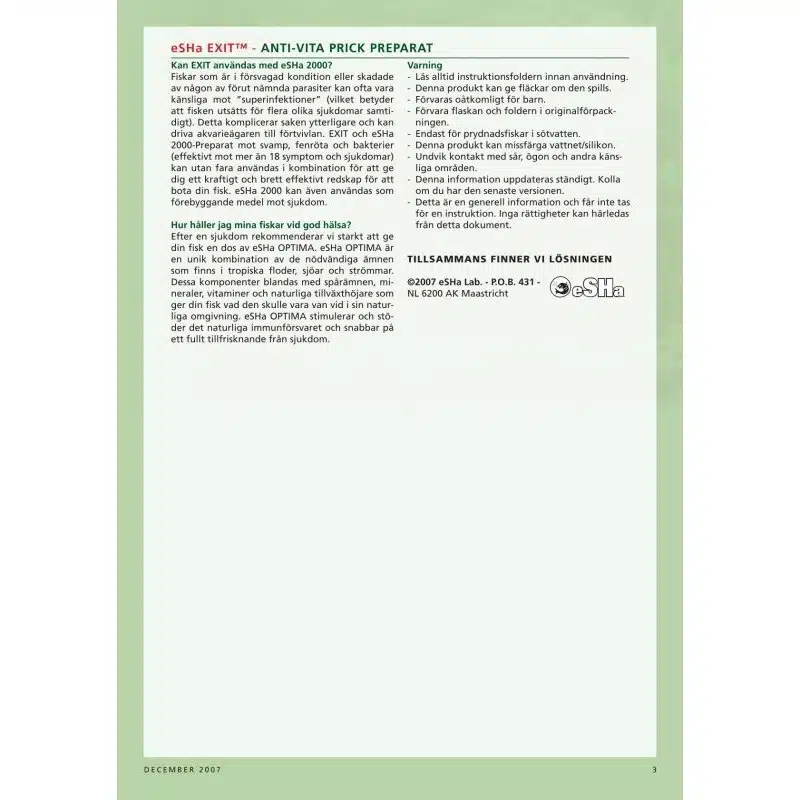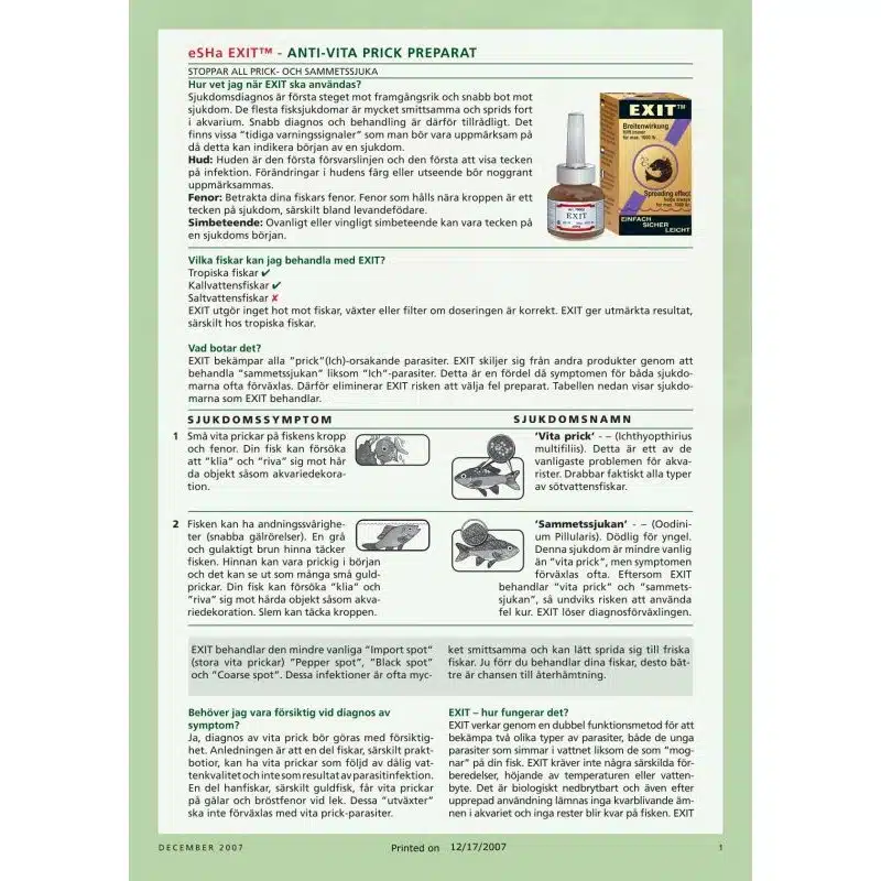Exit anti hvitprikk mot alle prikk sykdommer, helbreder fløyelssyken. Virker raskt. Kan brukes for følsomme tropiske fisker. Behandler 1000 l. I kombinasjon med eSHa 2000 gis et bredt, effektivt redskap for å helbrede de fleste sykdommer.