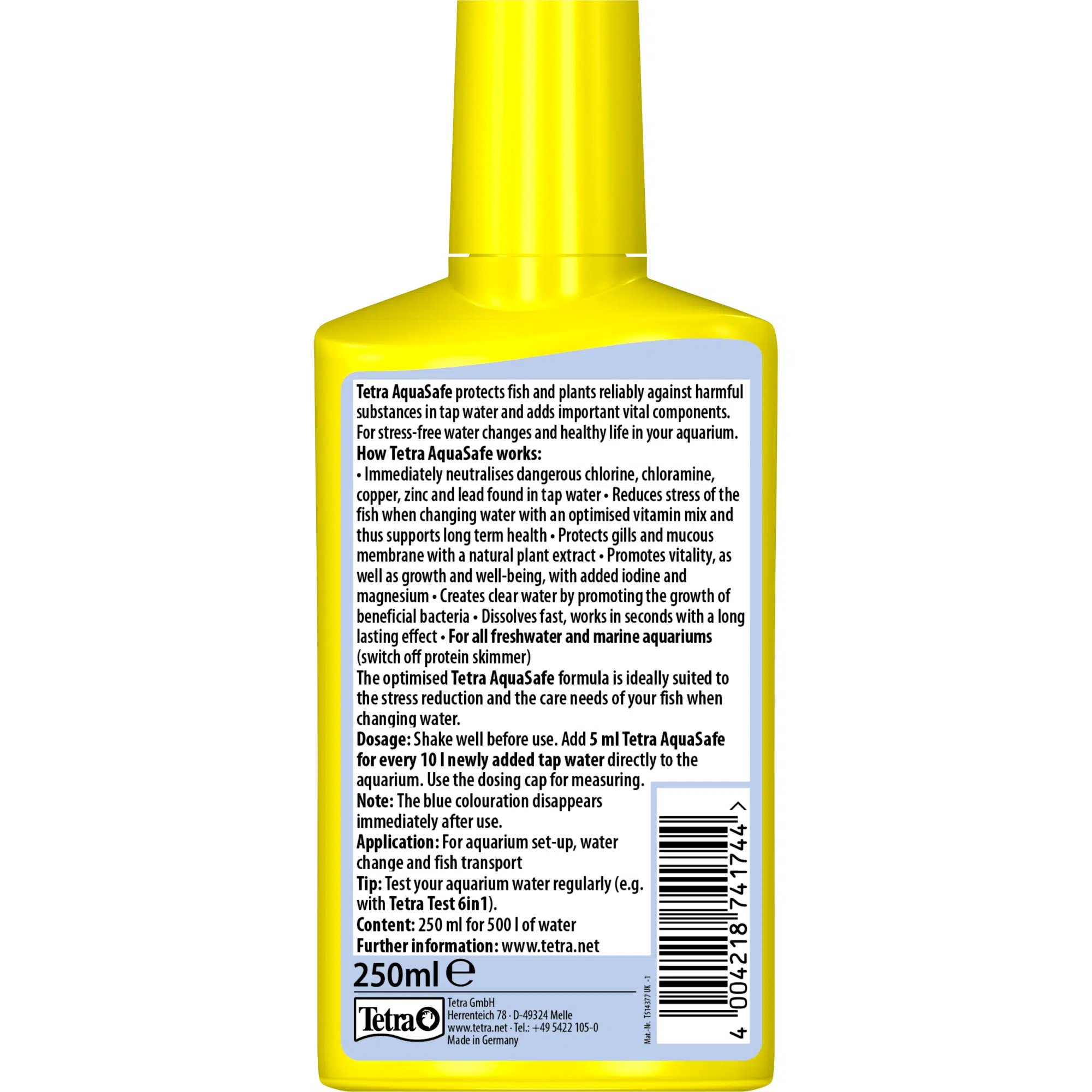 Tetra AquaSafe gjør vann fra springen trygt for fisk og beskytter fisk og planter pålitelig mot skadelige stoffer i vannet.