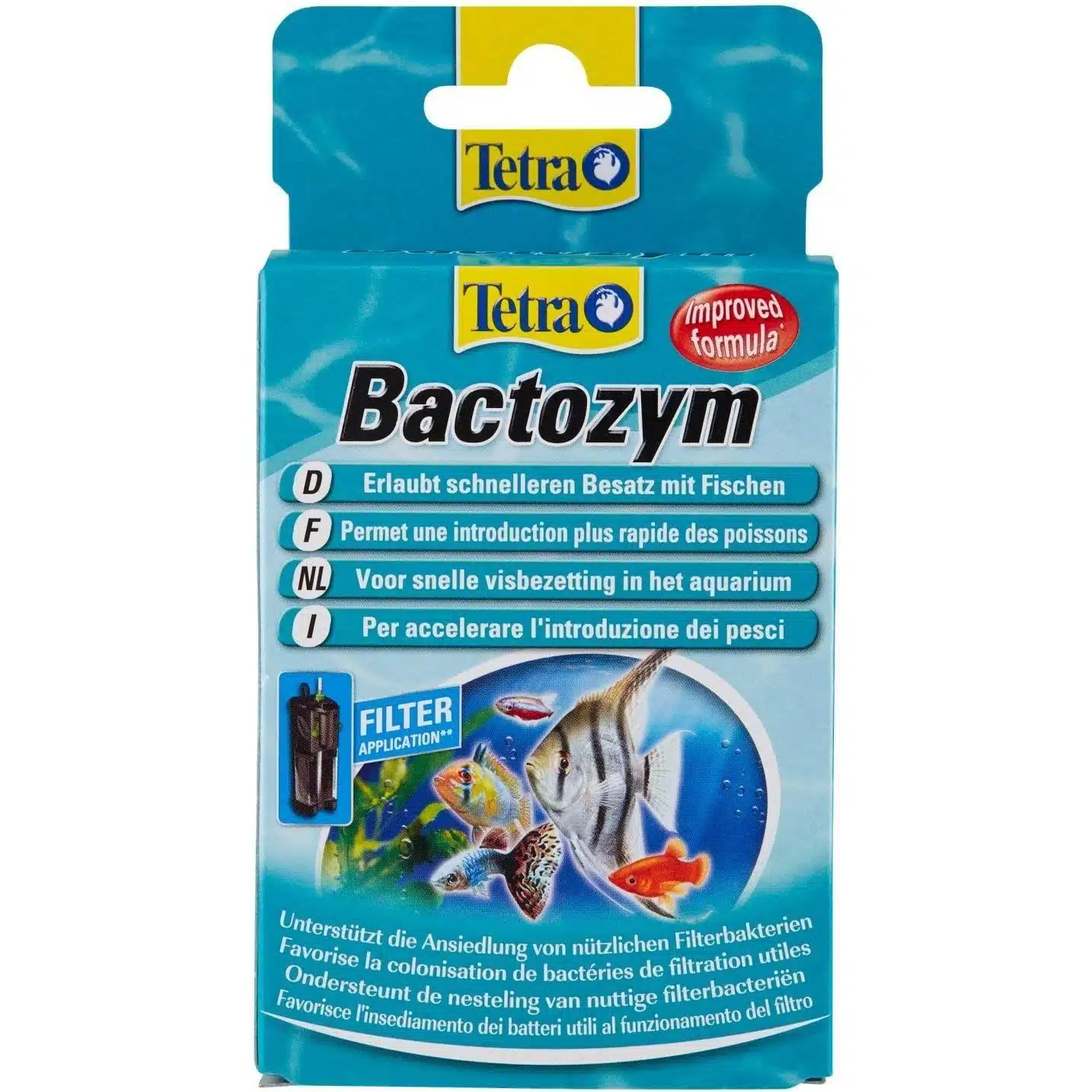Bakteristarter til nye akvarium, forbedrer vannkvaliteten og reduserer ammoniakk og nitritt. Tetra Bactozym gjør at fisk kan tilsettes akvariet (1000 liter) etter 24 timer. Bactozym jobber for å fremskynde utviklingen av gode bakterier i filtre.