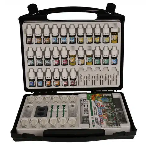 Dette omfattende kittet dekker alle kritiske parametere for ferskvannsakvarier: pH i tre områder, karbonathårdhet (KH), totalhardhet (GH), fosfat (PO4), nitritt (NO2), nitrat (NO3), kobber (Cu), silikat (SiO2), oksygen (O2), ammonium (NH4) og CO2 via pH/KH-tabell. Bruker komparator-system som kompenserer for vannfarge, med enkel reagens-tilsetning og fargeskala-avlesning. Inkluderer barne-sikre reagensflasker, kuvetter, sprøyter, skje, termometer, komparatorblokk og vanntett koffert – refiller selges separat.