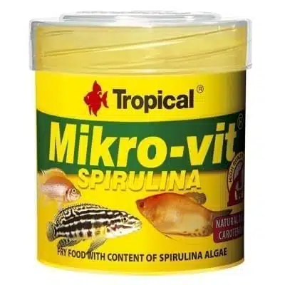 Tropical Mikrovit Spirulina er en spesiell mikro-supplerende yngelmat, som gir den lille fisken naturlige karotenoider (pro-vitamin A) og stimulerer vekst og god helse, samt oppmuntrer til utvikling av sunne pigmentceller, grunnlaget for intens fargelegging. Tilsetningen av zeolit ​​fremmer et sunt fordøyelsessystem og frigjøring av giftstoffer fra fiskens kropper.