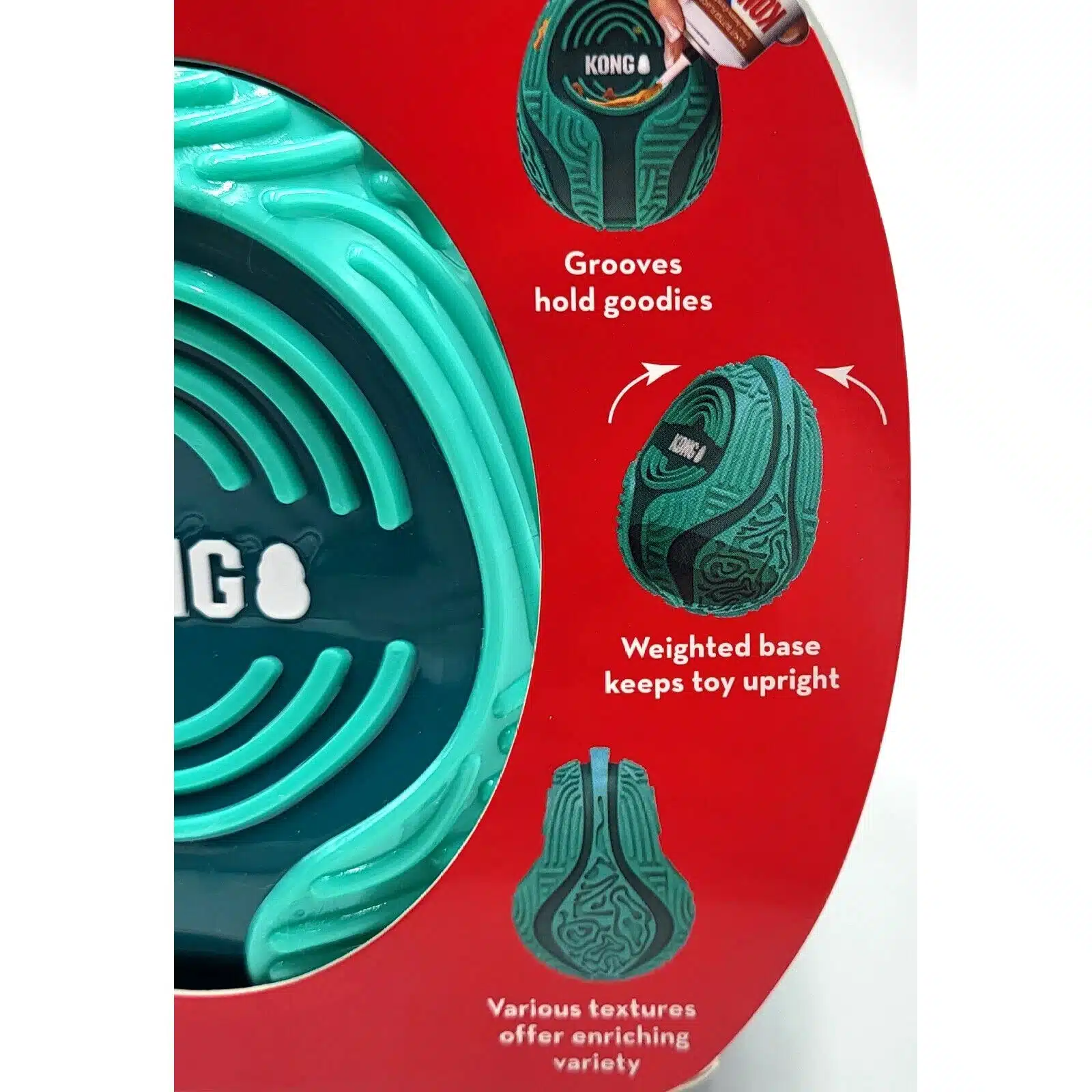 Leken har en stabil, tung bunn for å unngå søl og bevegelser som motiverer til aktivitet uten å tippe over. KONG er kjent for kvalitet, og denne leken tåler både ivrige tunger og hverdagslig bruk. -