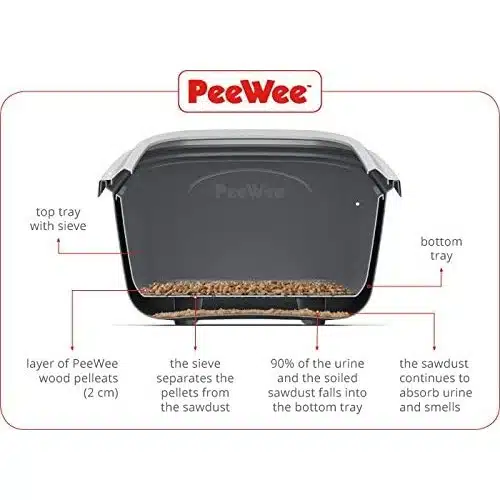 PeeWee trepellets er laget av svensk gran og furu, og er 100 % biologisk nedbrytbare. Deres unike sammensetning gjør dem i stand til å absorbere vond lukt fullstendig, samtidig som de holder kattetoalettet rent og tørt. Når katten bruker PeeWee kattedoen, vil opptil 90 % av urinen bli fanget i den nedre beholderen, mens det som er igjen i den øvre beholderen blir til sagflis. Dette gjør rengjøringen enkel – du trenger bare å kaste den brukte sagflisen.