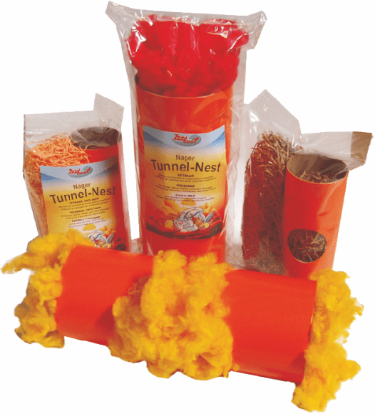 Zoobest tunnel reir, laget av resirkulert papir, er forberedt med tre åpninger og tilgjengelig i to størrelser: det lille røret for hamstere og mus og det større røret for marsvin, rotter, chinchillaer osv. På den ene siden tilbyr Zoobest Tunnel-Nest mulighet til å følge gnageres naturlige trang til å klatre og gnage, på den annen side kan de bygge seg en øm, koselig seng. Det vedlagte hekkematerialet er tilgjengelig i to varianter for valg: viskose eller kuttet papirfaste, begge assortert i forskjellige farger.
