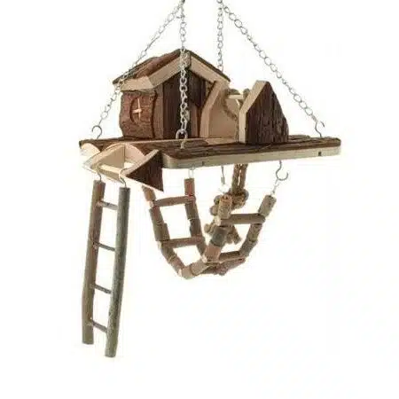 Lekeplass Janne inneholder alt kjæledyret ditt trenger for aktiv lek og hvile. Med inkludert hus, hengebru, stige og tau får både fugler og smågnagere mulighet til å klatre, utforske og finne sitt eget koselige hjørne. Det lille huset fungerer som et trygt tilfluktssted hvor kjæledyret kan trekke seg tilbake og slappe av.