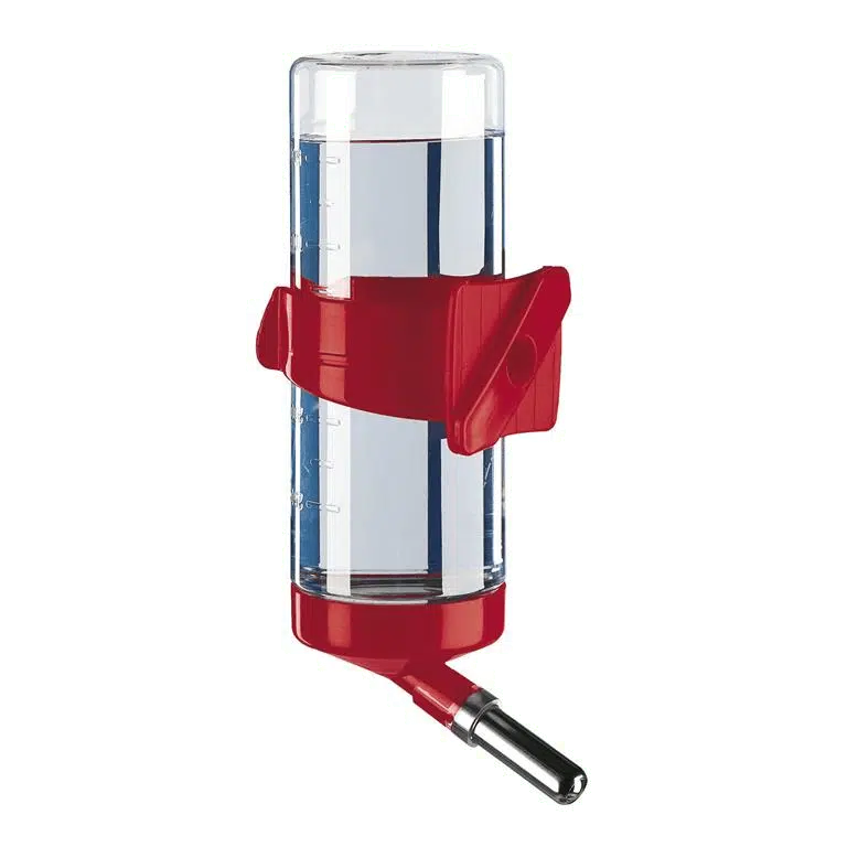 Vannflaske drinky er designet med dyrets komfort i tankene. Med sitt rustfrie stålmunnstykke og globeventil, sørger den for perfekt vanntetthet, slik at du slipper søl. Den sterke plastholderen gir stabilitet, og flasken kan enkelt festes til alle typer trådnettbur, noe som gjør den meget allsidig.