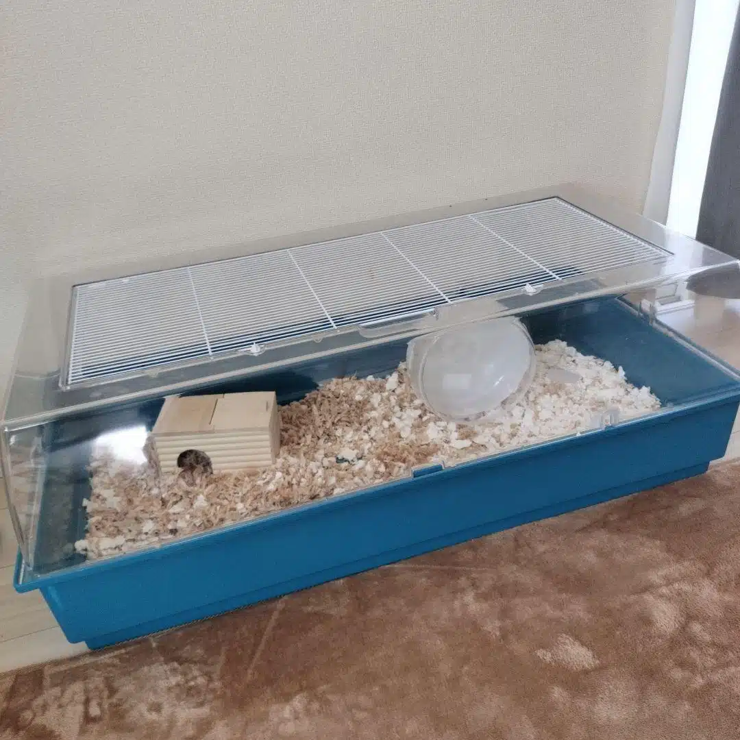 Utstyr buret med nødvendig tilbehør som hus, hjul, tuneller, matskål, vannflaske og leker