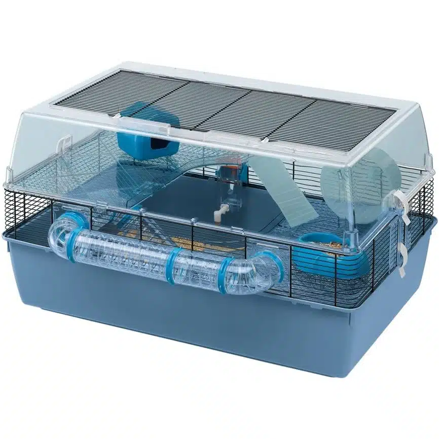 Hamsterburet består av tre nivåer og inneholder blant annet et koselig hus, stige, vannflaske, løpehjul på 15 cm og et tunnelsystem. Dette er tilbehør som hjelper til at kjæledyret ditt skal trives og ha det gøy.