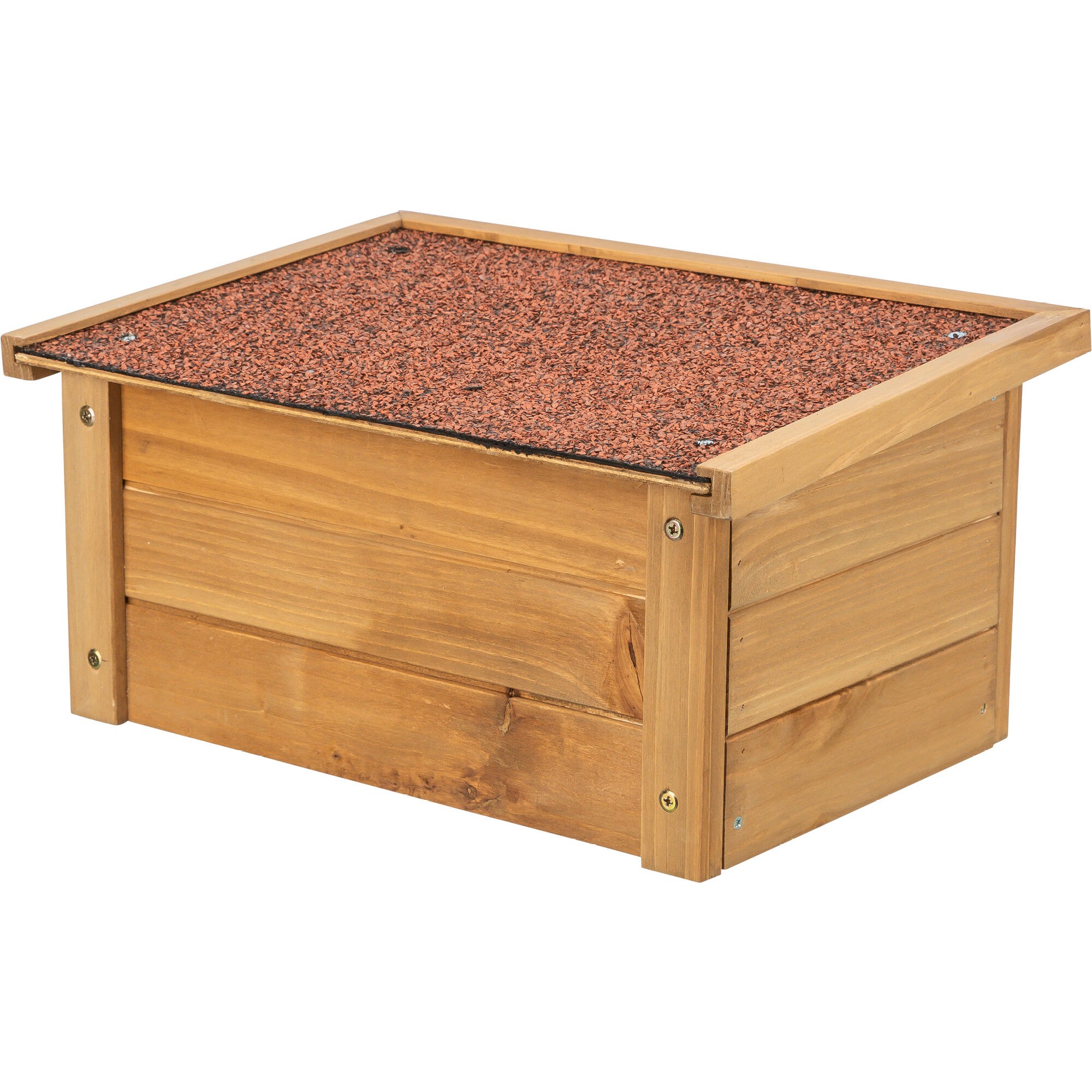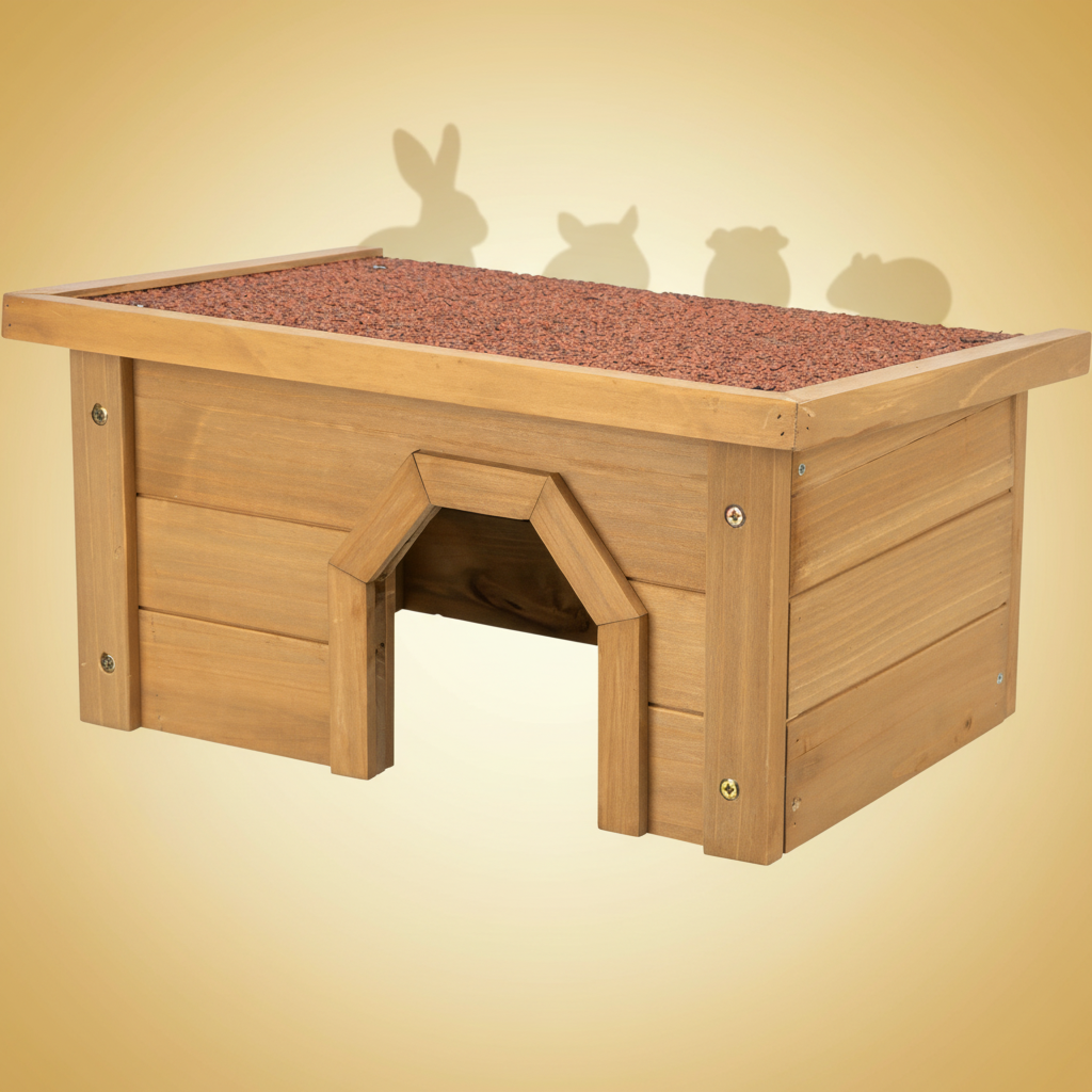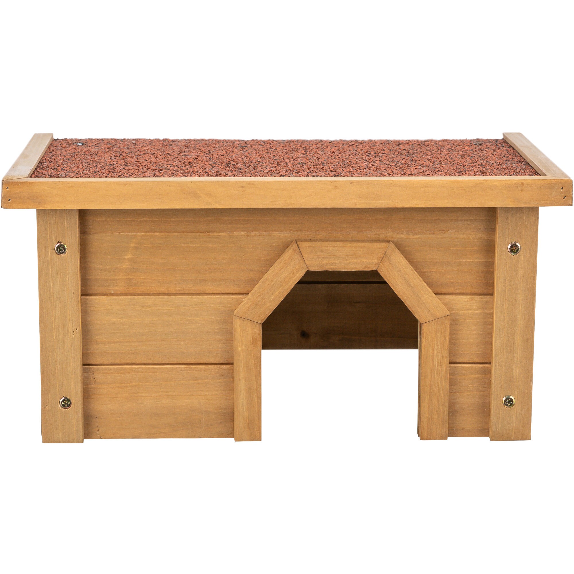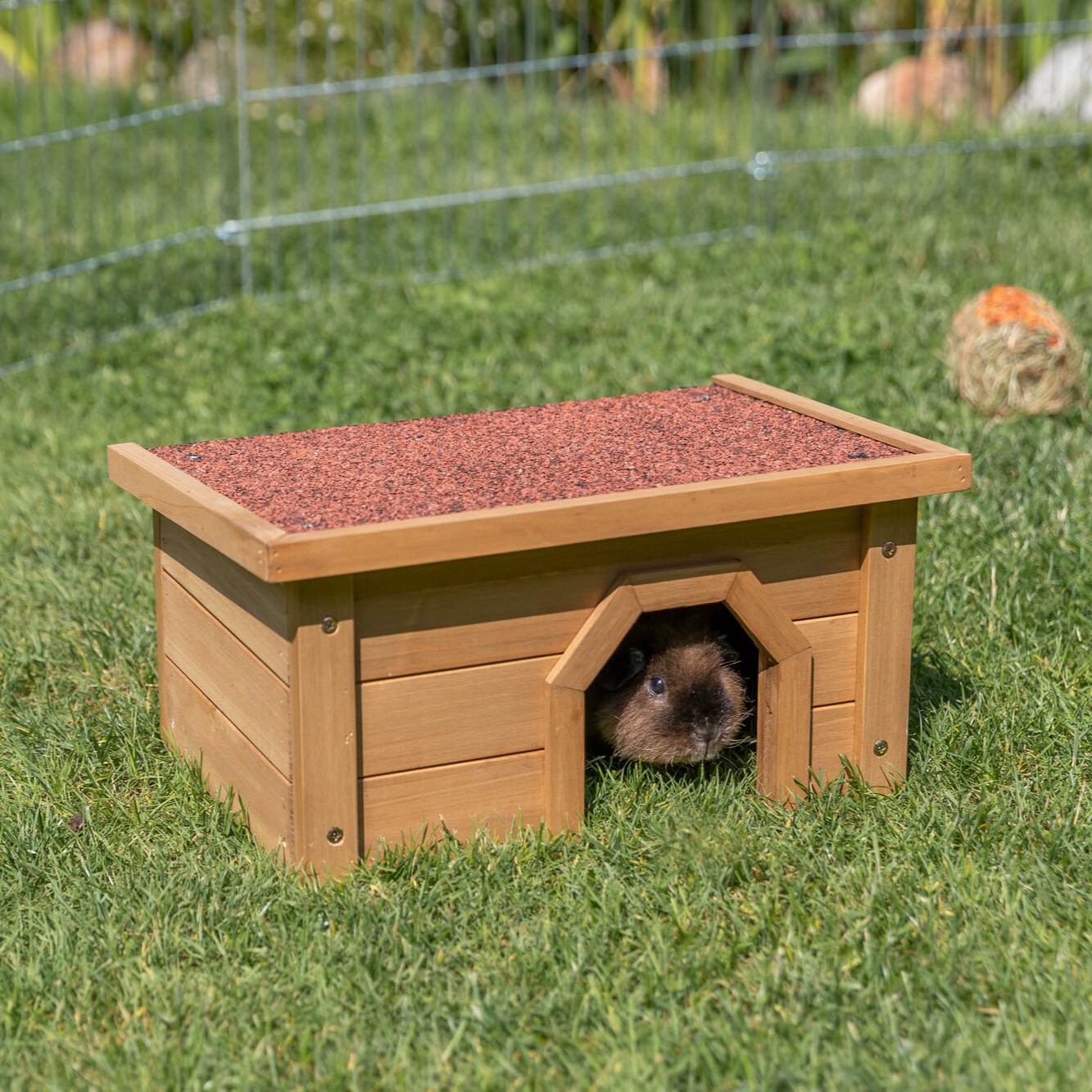 Lavt utendørs tilfluktshus i lakkert furu med tagpapptekket tak. Gir kanin og marsvin skjermet gjemmeplass i løpegården. 40×20×28 cm.