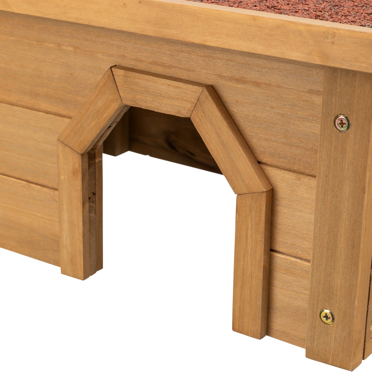 Den buede inngangen er dimensjonert slik at kaniner og marsvin enkelt kan gå inn og ut uten å klemme seg. Det lave taket gir dyrene en innestengt, trygg følelse inne i huset – noe som samsvarer med naturlig tilfluktsatferd.