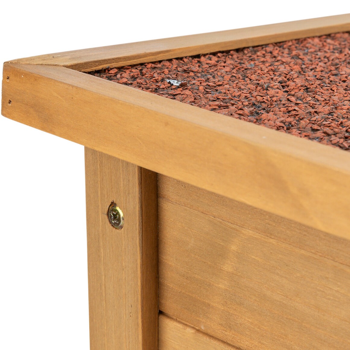 Huset er bygget av lakkert furu – en trebehandling som beskytter overflaten mot fukt og forlenger levetiden sammenlignet med ubehandlet tre. Taket er dekket med tagpapp som leder regnvann bort fra konstruksjonen og hindrer fuktinntrenging i skjøtene. Den mørkebrune fargen gjør huset diskret og naturlig i hage- og løpegårdsmiljøet.