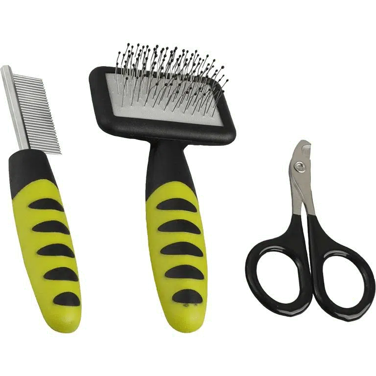 Pelsstell sett smådyr inneholder kam, børste og saks.
