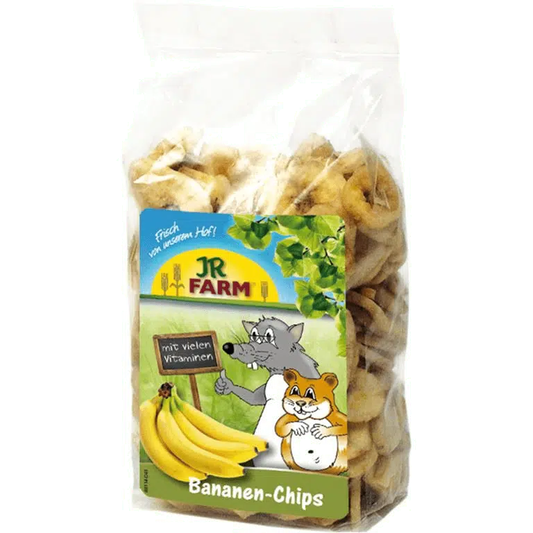 “JR Farm Banan-skiver – sprø og smakfulle snacks for smådyr, laget av banan, kokosolje og honning. Perfekt som belønning eller mellommåltid.”