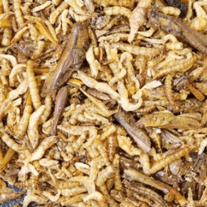 Ingredienser: Tørkede gresshopper (24%), tørket melorm (33%), tørkede reker (33%)
