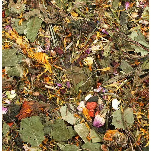 Ingredienser: Persille (8,5%), havreflak (8,3%), hveteflak, rødbeter, erteflak, lucerne (6,4%), groblad, bjørkeblader, gulrøtter, ringblomst (5,0%), nesle, hvete, puffet hvete, maisflak, puffet mais, havreurter, kornblomst, sitronmelisse, løvetann (2,0%), peppermynte, alpeurter, rose og rødkløver (0,6%).