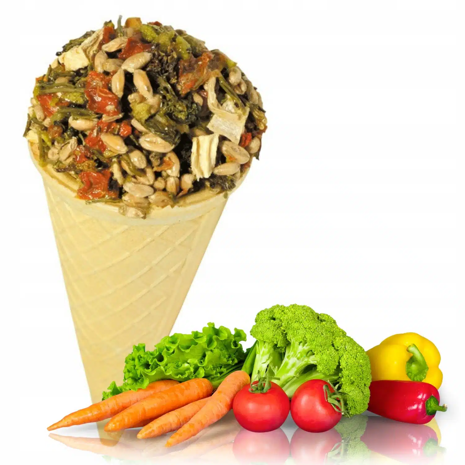 Hvetemel, vegetabilsk olje, potetstivelse, hvete, tørket gulrot, tørket pastinakk, tørket brokkoli, gjær, maltodekstrin. Tilsetningsstoffer: sensoriske tilsetningsstoffer: fargestoffer.