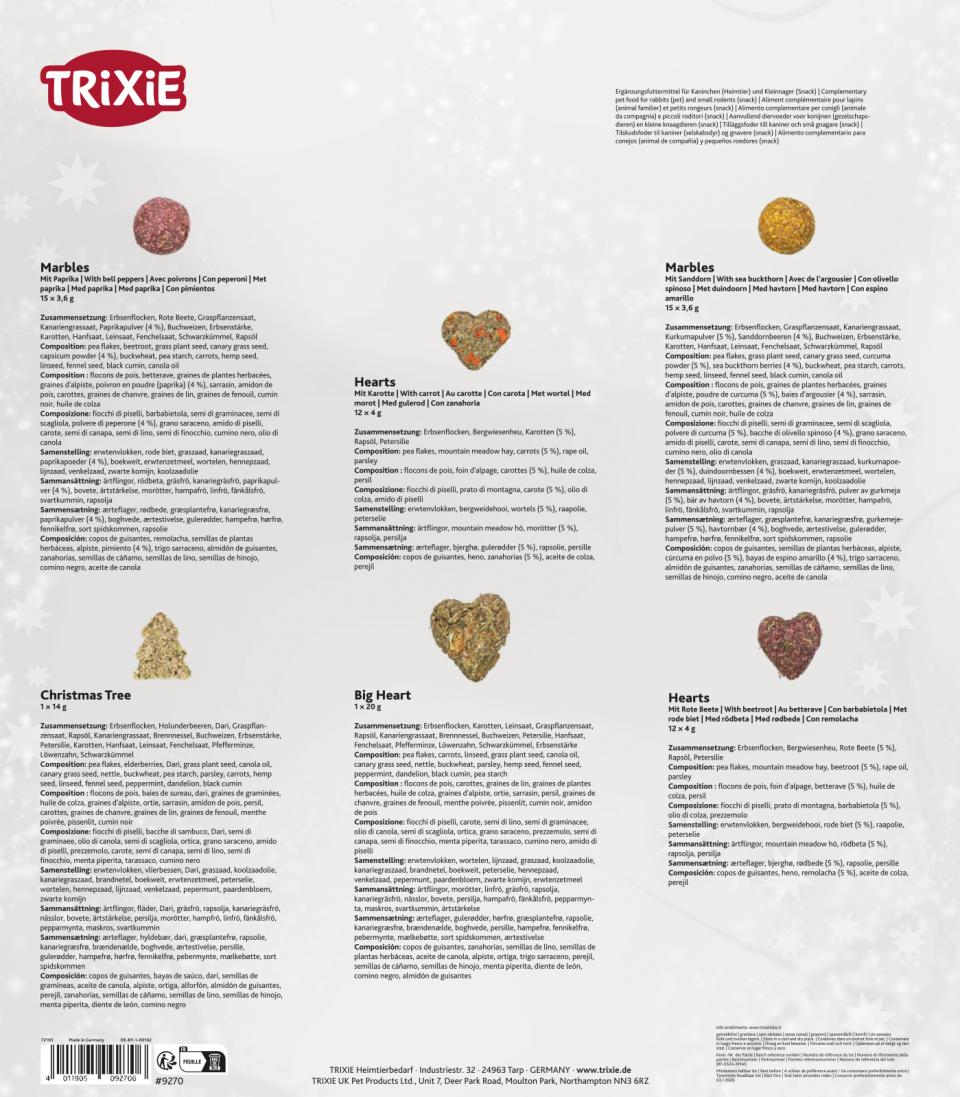 Kalenderen inneholder en blanding av naturlige snacks nøye utvalgt for å passe hamstere, marsvin, kaniner og andre smågnagere. Godbitene er laget med omtanke, uten tilsatt sukker og med ingredienser som støtter et sunt og variert kosthold.