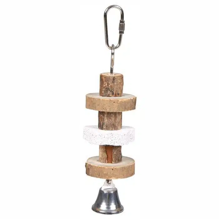Fugleleken holder din fugl mentalt stimulert og fysisk aktiv gjennom gnagende aktiviteter som er naturlige for alle fuglearter. Lavasteinen bidrar til å holde nebbet i god form ved å gi den naturlige slitasjen som fugler trenger, mens treklosssene tilfredsstiller fuglens naturlige trang til å tygge og utforske. Den innebygde bjellen uten klapper skaper en dyrevennlig lydopplevelse som vekker nysgjerrigheten uten å bli for støyende.