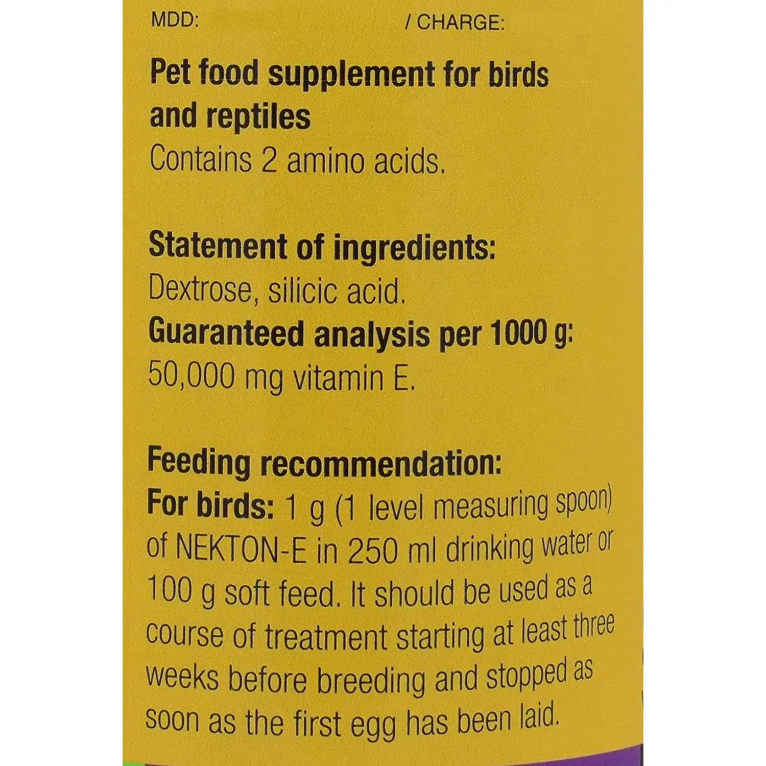 Fugler: 1 g NEKTON-E i 250 ml drikkevann eller 100 g myk mat.