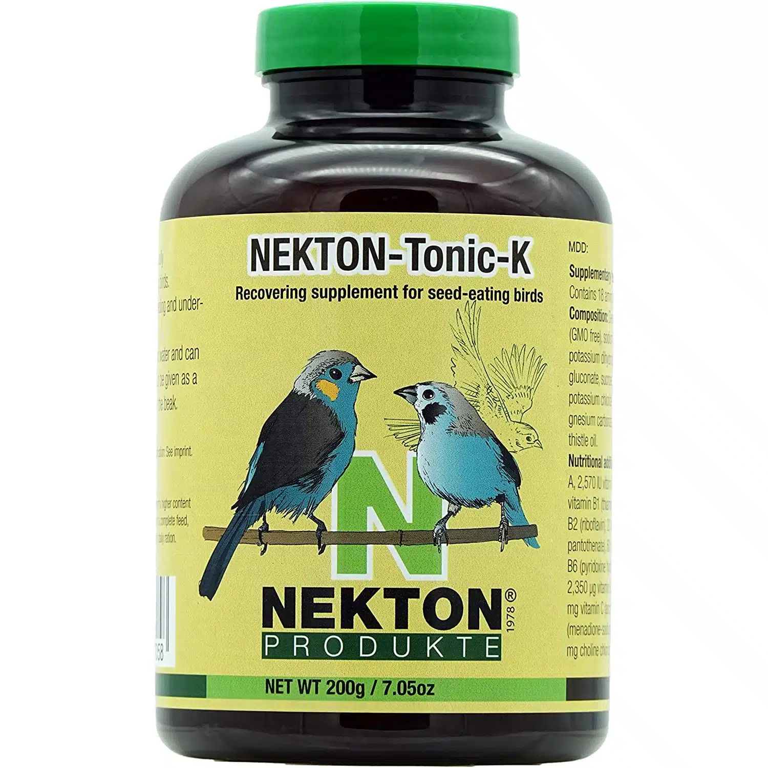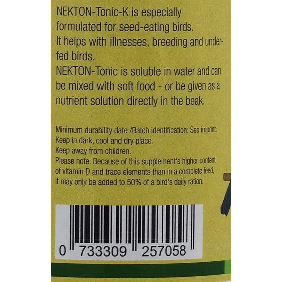 Nekton tonic K, nekton bird vitamins, er for frøspisende fugler. Dette er det ideelle stoffet for syke eller svake fugler for å få dem friske og raske igjen. Tonic K inneholder alle stoffene fuglen trenger, stoffene vil bli tatt i bruk av kroppen umiddelbart uten hjelp fra fordøyelsessystemet. Dette vil ha positiv effekt på sykdommer, fjørfelling, avl, avklimatisering og stress. Nekton tonic K kan gis som fullfòr i kortere perioder ved behov.