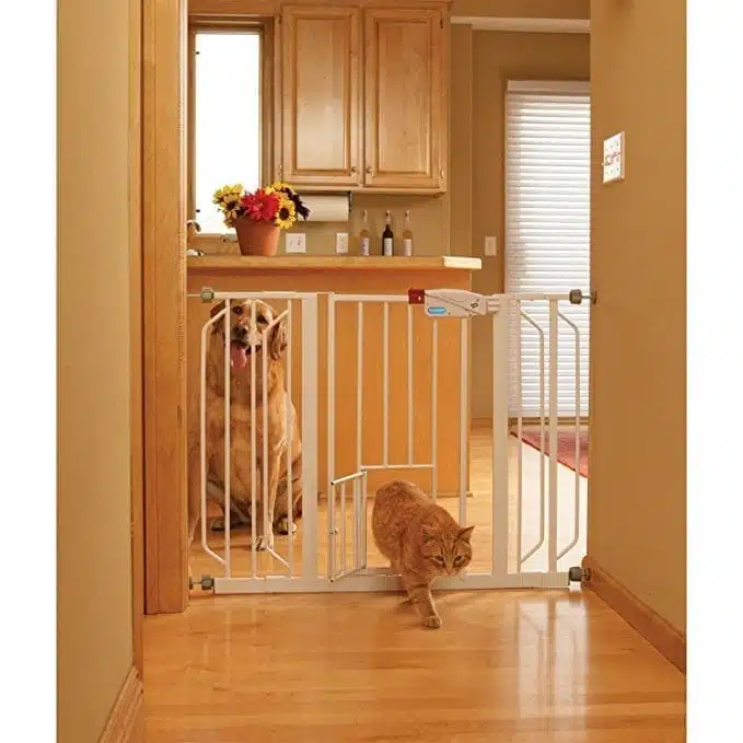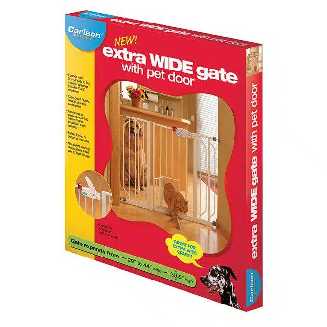 Carlson ekstra bred Walk-Thru grind 76 cm med kattedør. Justerbar bredde 74–112 cm, enkel trykkmontering og solid stålramme – perfekt til brede åpninger.