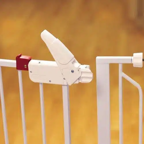 Takket være den praktiske gjennomgangskonstruksjonen trenger du ikke ta ned grinden for å komme forbi. Den har et brukervennlig håndtak som frigjøres med ett enkelt trykk – enkelt for deg, men trygt nok til å holde hundene på plass.