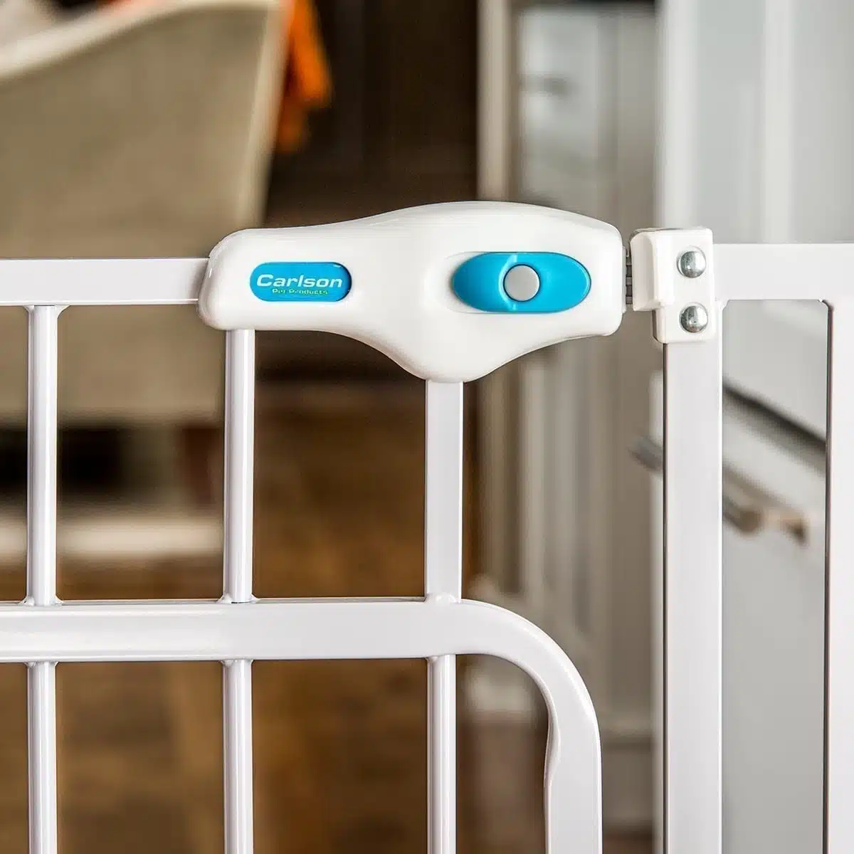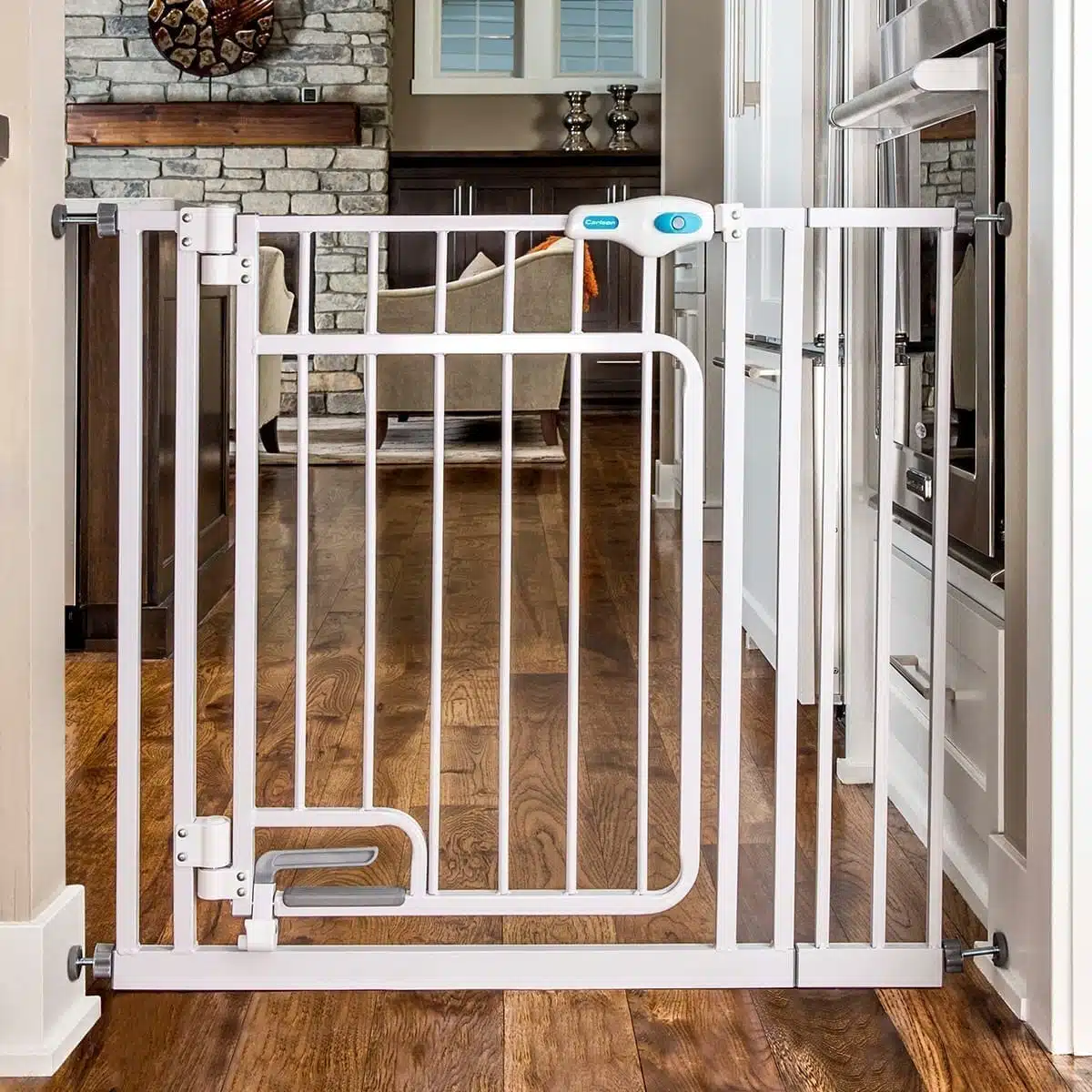 Carlson grind handsfree walk-thru hvit 81×76-112cm er en smart grind som kan åpnes med foten, eller du kan bruke håndtaket.