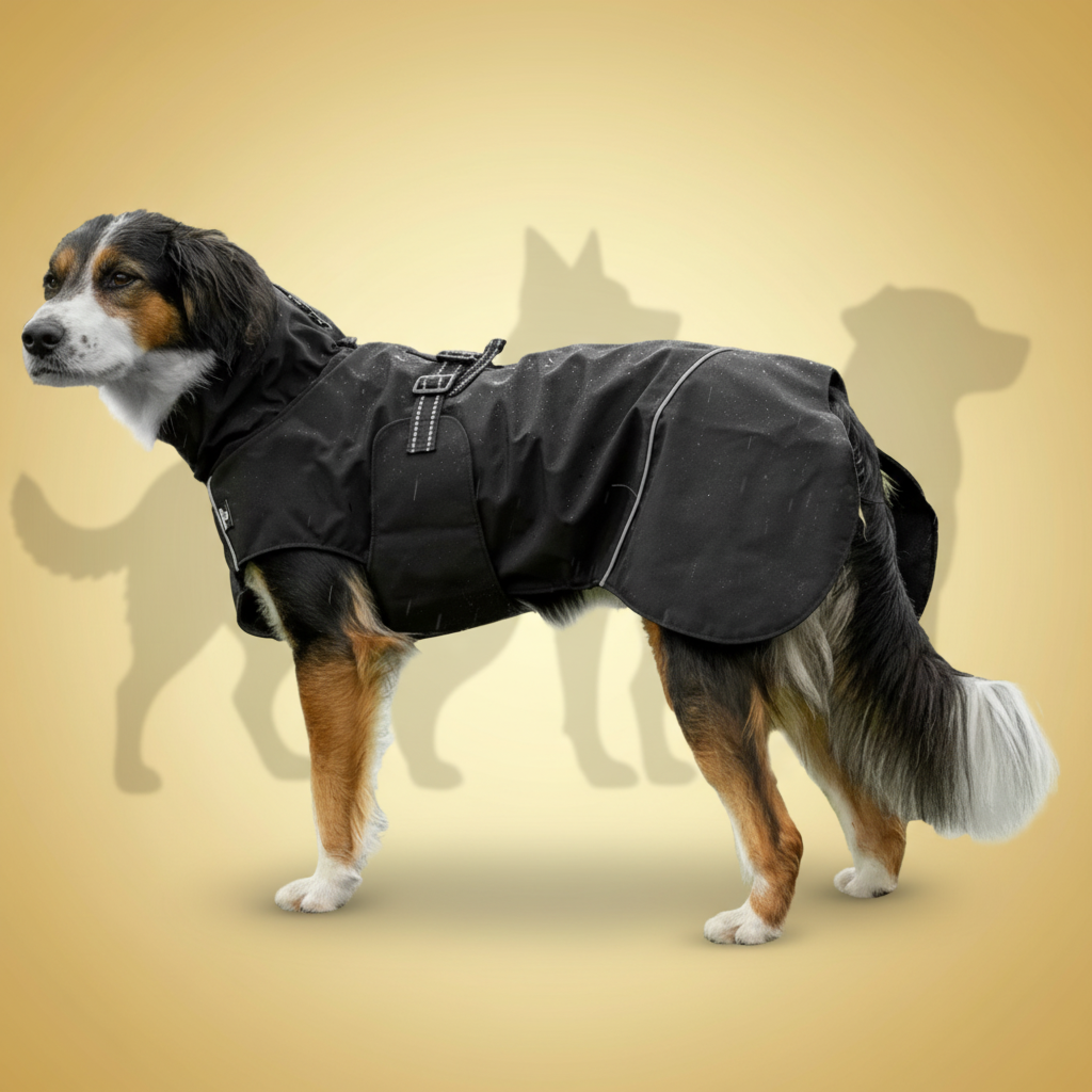 Et justerbart refleksbånd med klikkspenne går over ryggen og kan strammes inn for bedre tilpasning. Refleksdetaljer på regntrekket gjør hunden synlig i mørket og i dårlige lysforhold.