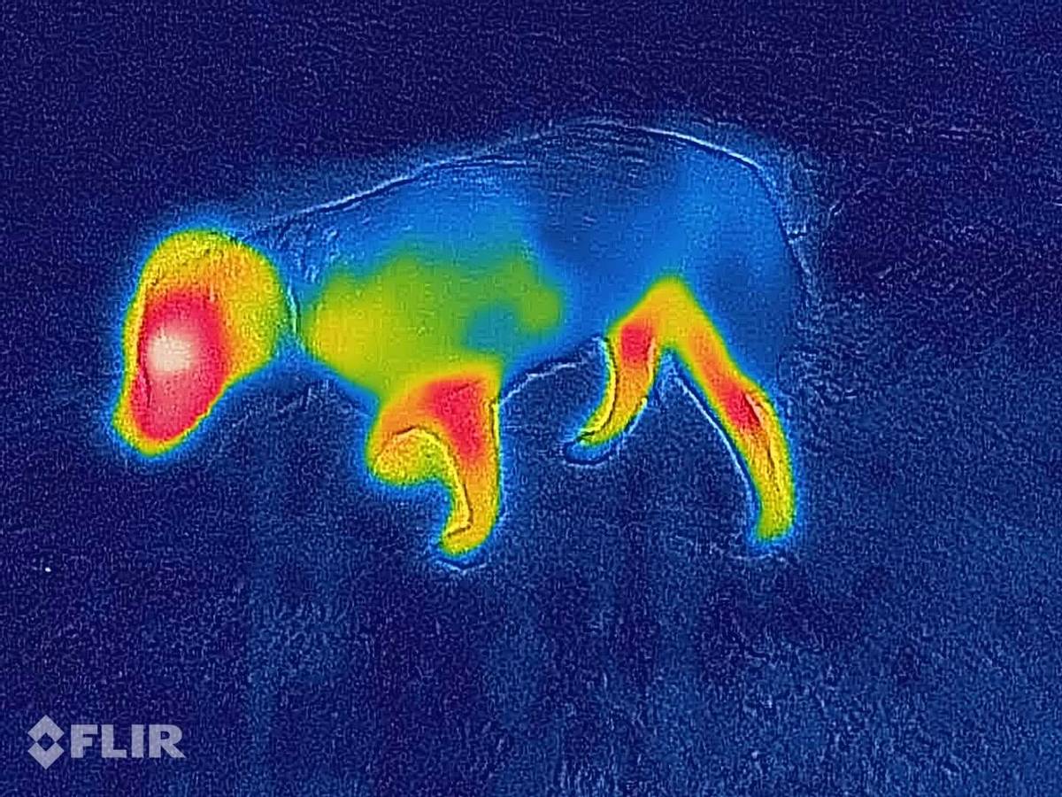 Bildet under er en hund med AMBASSADØR ulldekken på, det er tatt med FLIR termografikamera. (Det viser – beviser – at hunden ikke har varmetap der den har dekken på seg.)