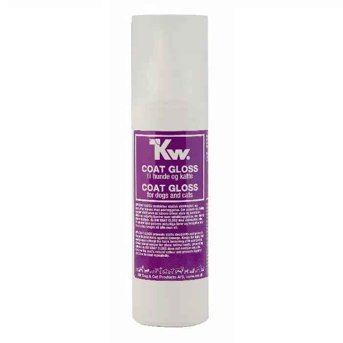 KW COAT GLOSS motvirker statisk elektrisitet og beskytter håret mot skader. Gjør pelsen lett, fyldig og skinnende uten at hårene blir stive og knekker. Gir naturlig kontroll over utstillingspels som aldri blir fete da KW COAT GLOSS ikke inneholder olje. Endrer ikke pelsens naturlige farge og beskytter mot smuss. Kan brukes så ofte du vil.