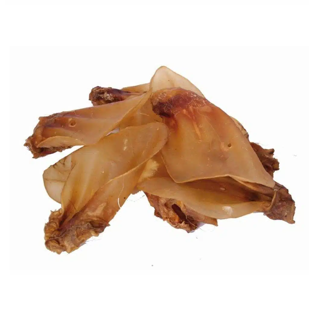 Kalv og Okseører er mildere for magen enn griseører. Husk at for mye proteiner kan være kilde til kløe hos hund.