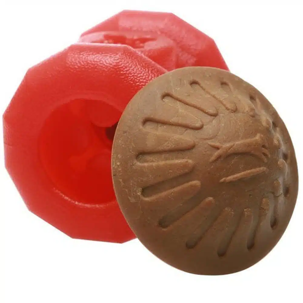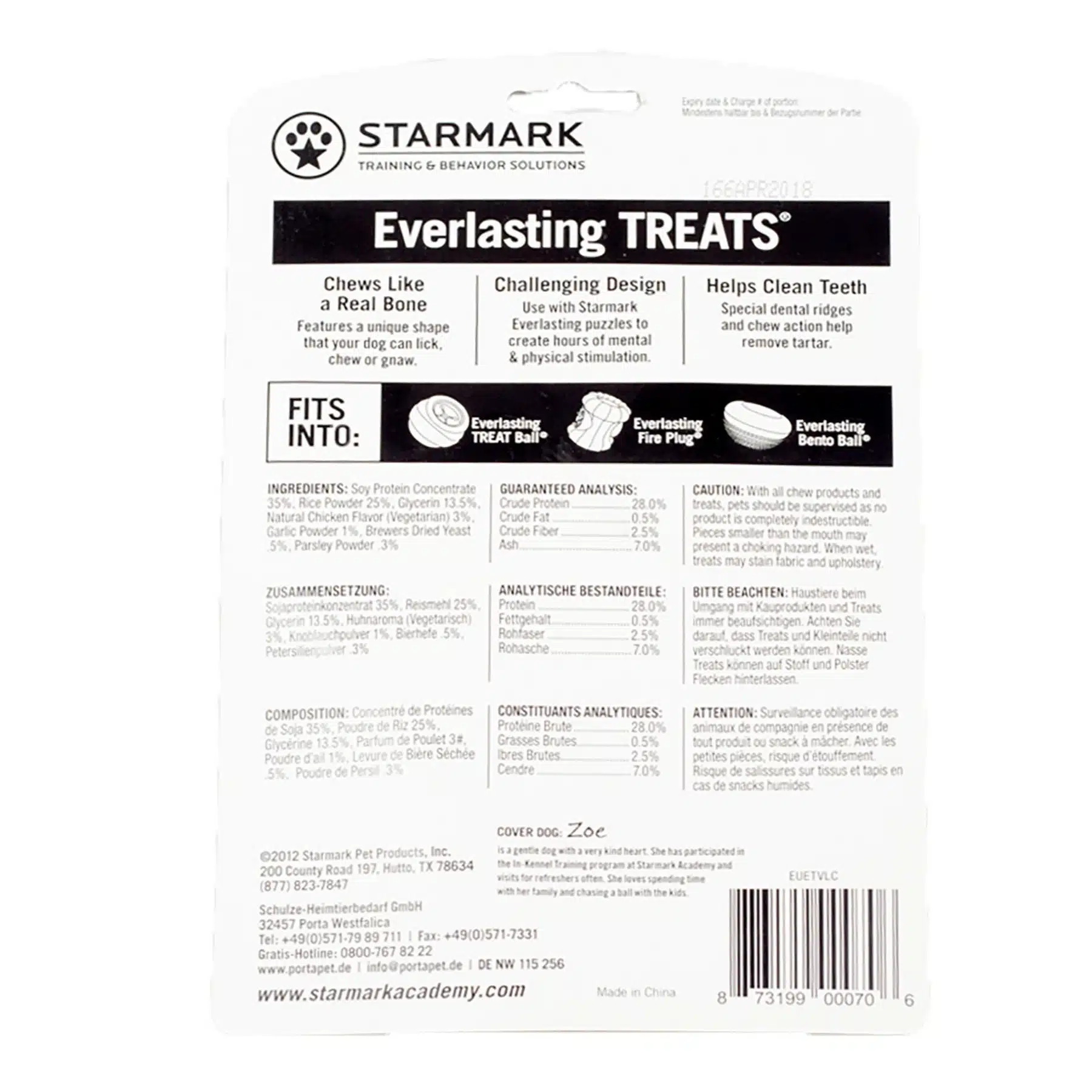 Ingredienser Everlasting Treat Ball: Soyaproteinkonsentrat 35 %, rismel 25 %, vann 20 %, glyserin 13,5 %, naturlig vegetarisk kyllingsmak 3 %, hvitløkspulver 1 %, ølgjær 0,5 %, vegetabilsk gummi 1 %, sitronsyre 0,5 %, natriumdiacetat 0,2 %, persillepulver 0,3 %.