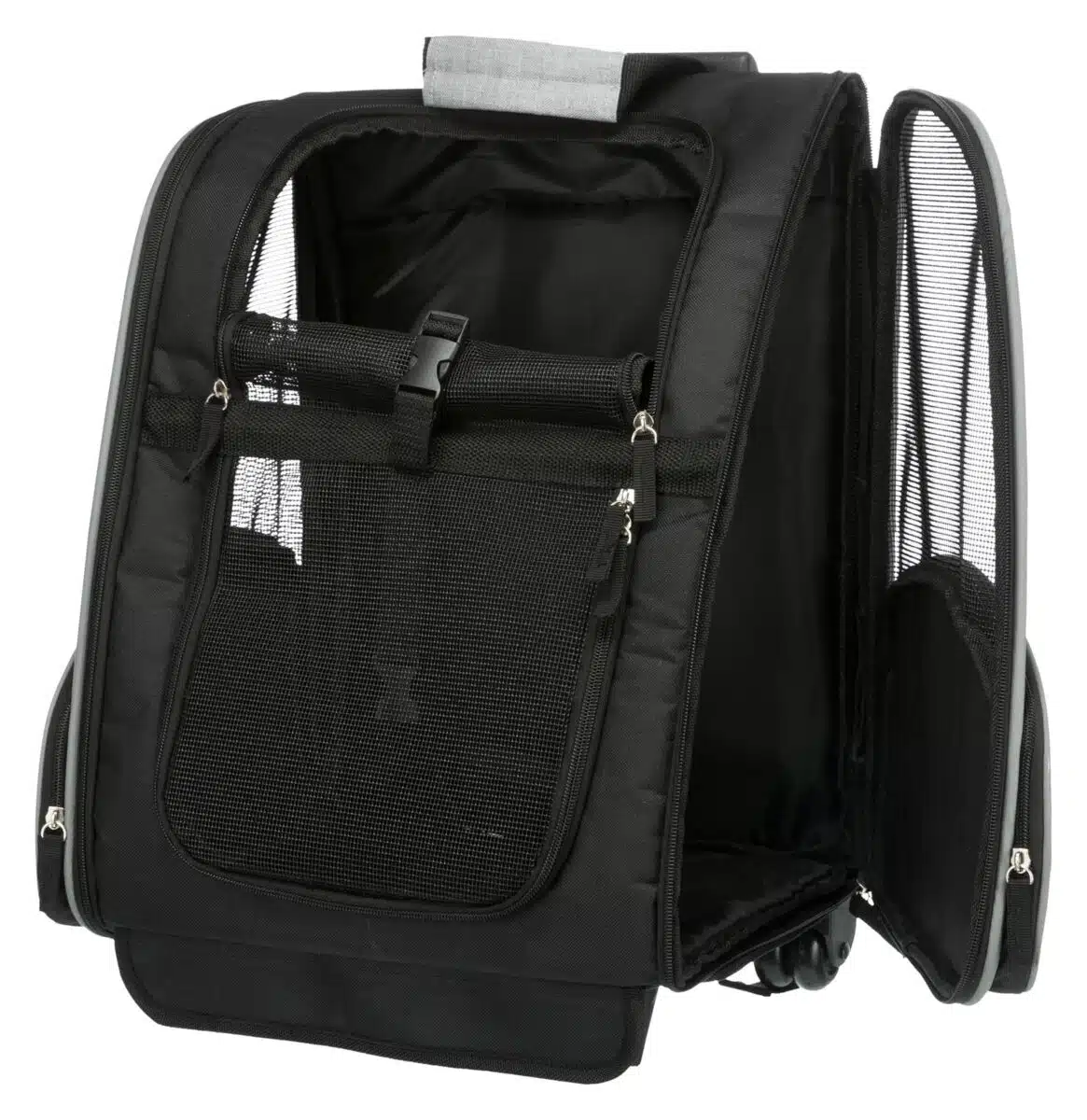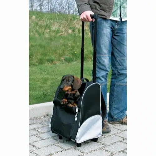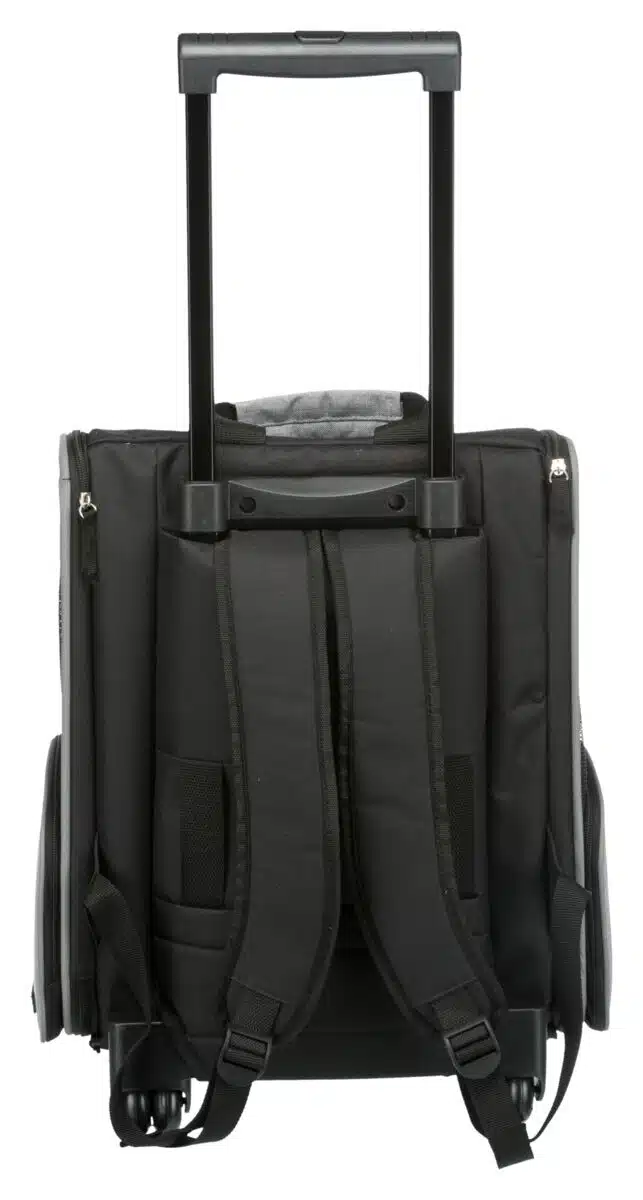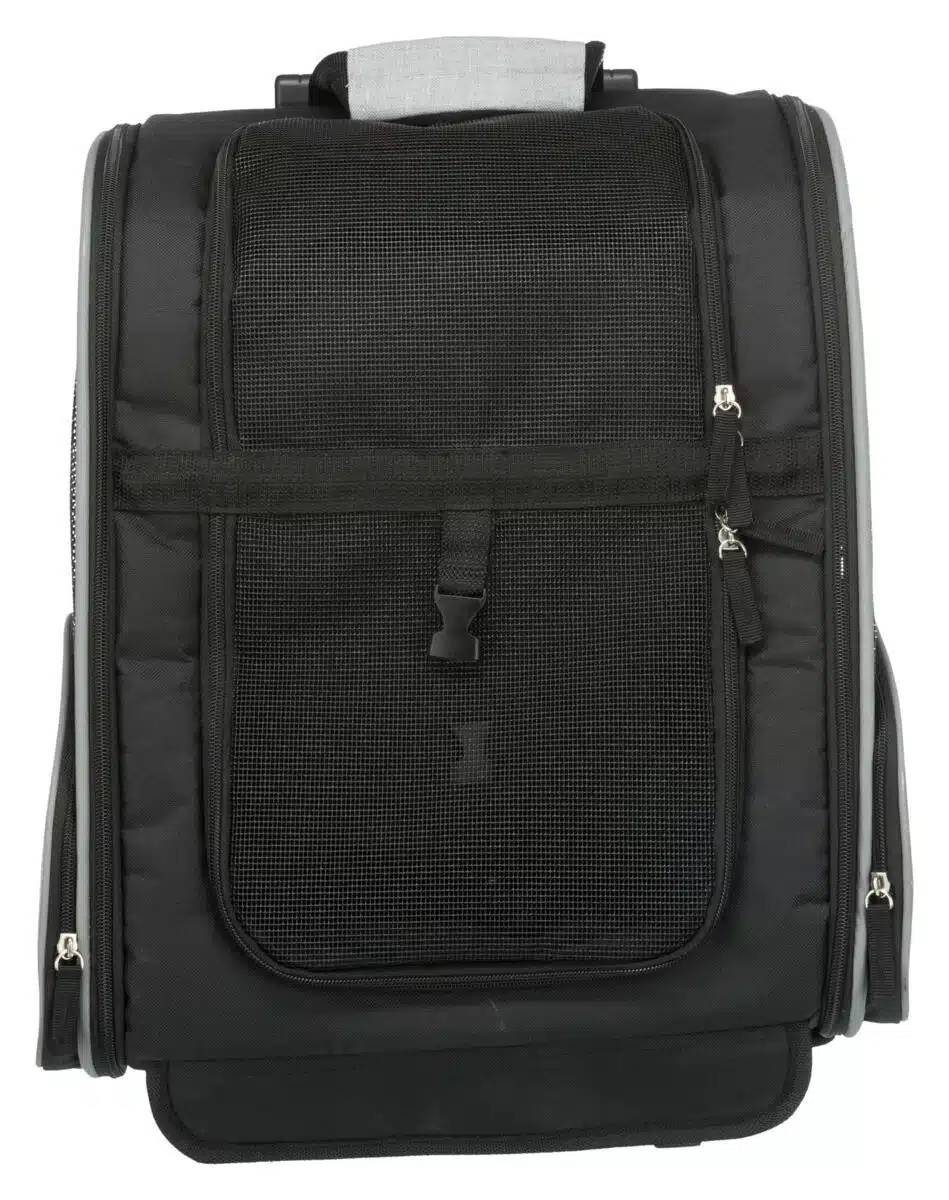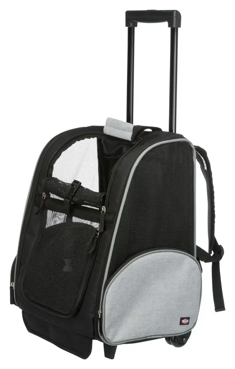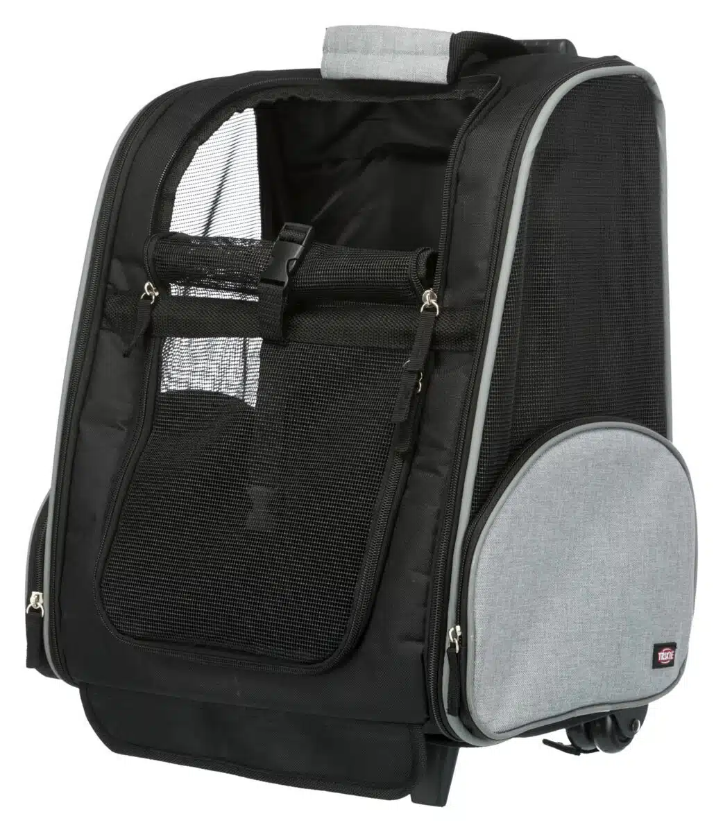 Kan også brukes som ryggsekk. Komfortabel på grunn av polstret, justerbar sele. Praktisk lomme for drikkeflaske, godbiter osv. Integrert line hindrer dyret i å hoppe ut. Nettinnsats sørger for god lufttilførsel. Kan festes til sikkerhetsbeltet i bilen ved hjelp av stropper på baksiden. Polstret bunn. Trixie Trolley