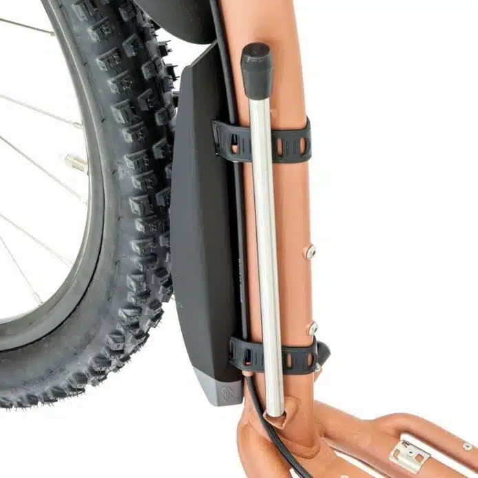 Støtten er lett å ettermontere, er strikkbasert og er i oppslått posisjon ikke i veien når man skal sparke på sykkelen.