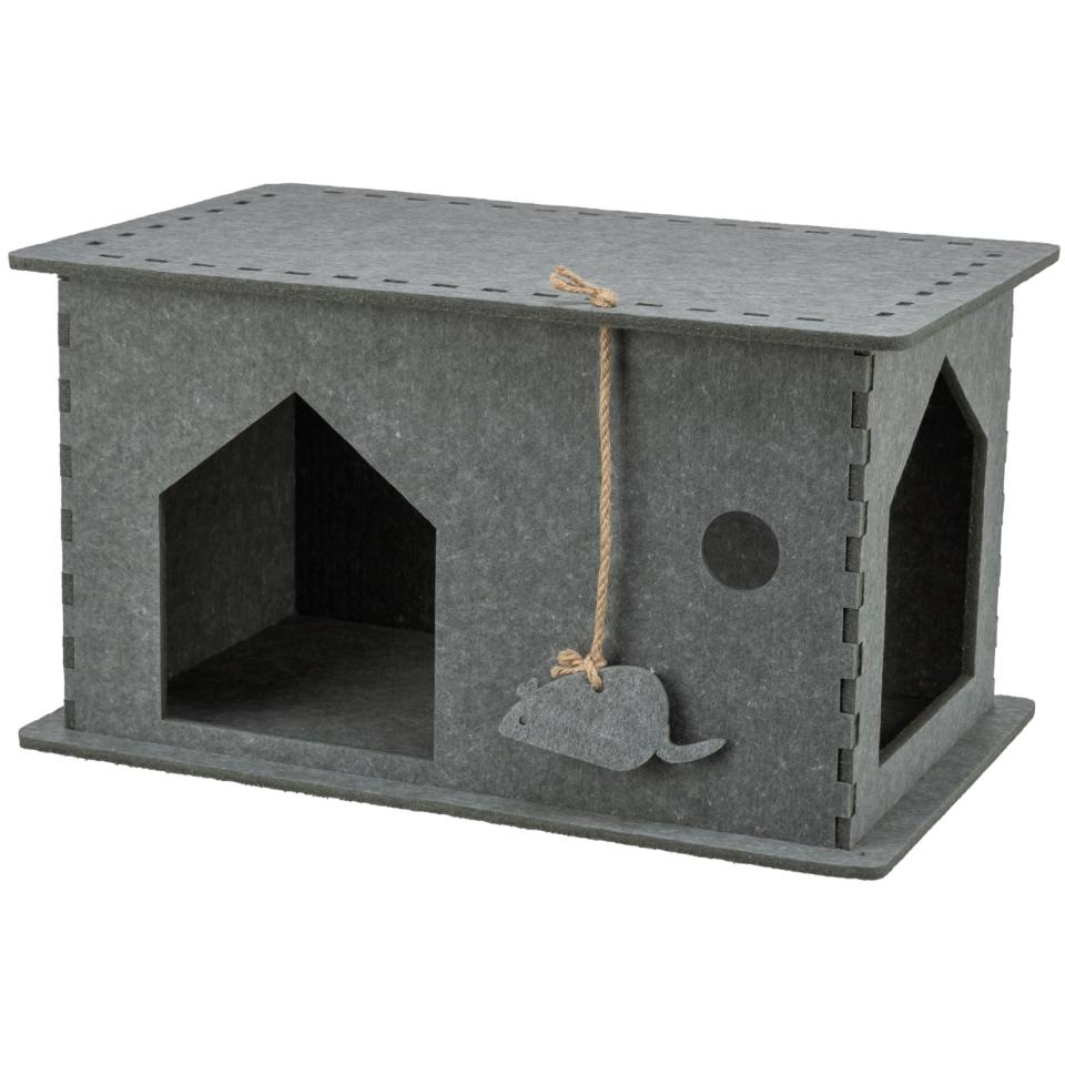 Denne lekegrotten i filt (polyester) er både formstabil og slitesterk – perfekt for nysgjerrige og lekne kjæledyr. Den har to innganger som gir enkel tilgang og ekstra moro, samt leker festet i snor som stimulerer til aktiv lek. Grotten er enkel å montere og passer utmerket som et koselig og underholdende gjemmested i hjemmet.