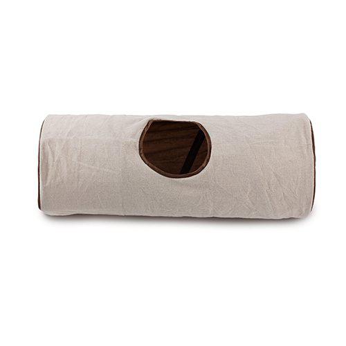 Tunnel i beige canvas med plysj på innsiden. Et hyggelig sted for katten å leke og slappe av.