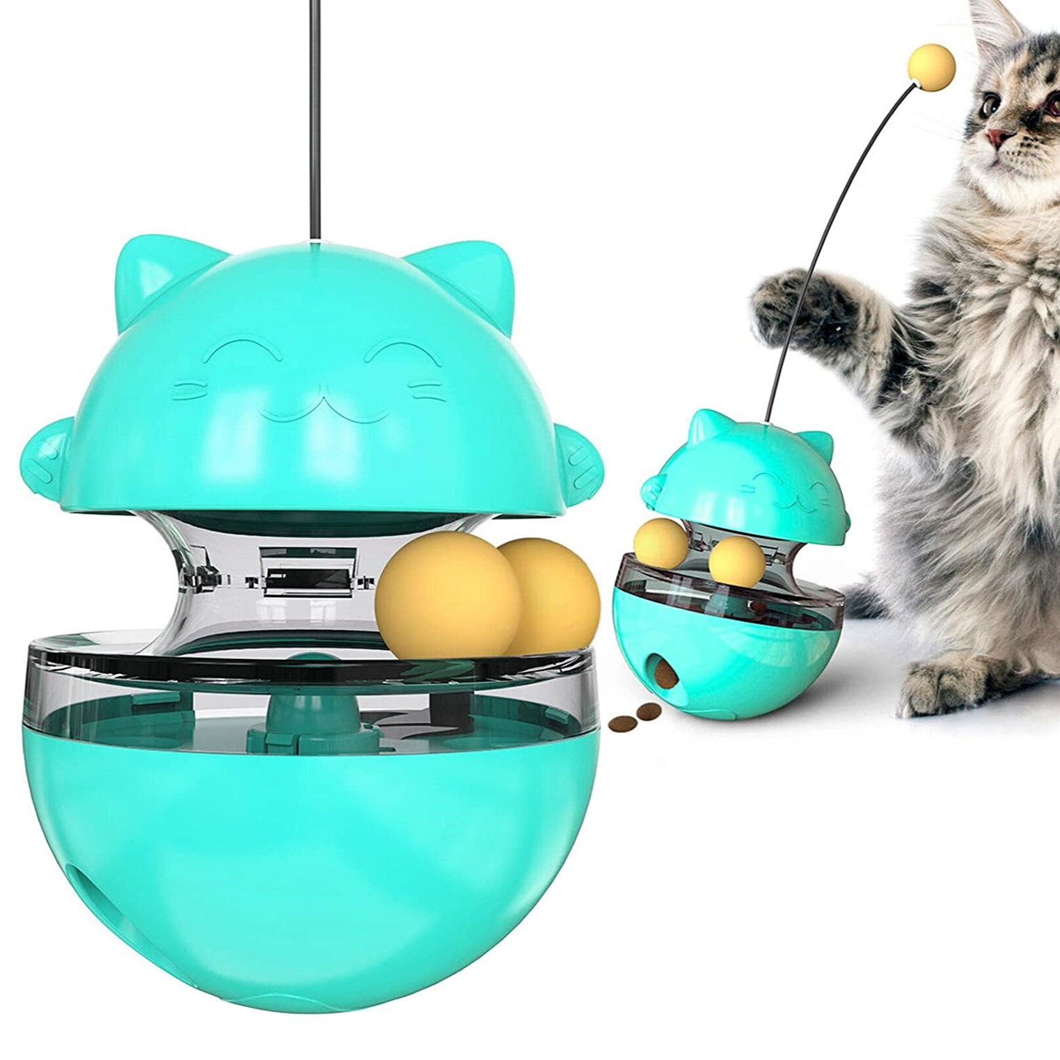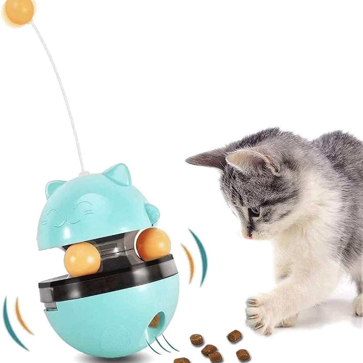 - Design med doble rullende baller, og katten kan leke mens den spiser. Når katten plutselig eller konstant snur godbitautomaten rundt med potene, vil kattungesnacksen komme ut av sidehullet som en godbit for katten. Dette vil oppmuntre katten til å fortsette å jage, slik at katten kan trene og holde seg frisk, og redusere kjedsomhet og holde helsen gjennom sunne spill og øvelser
