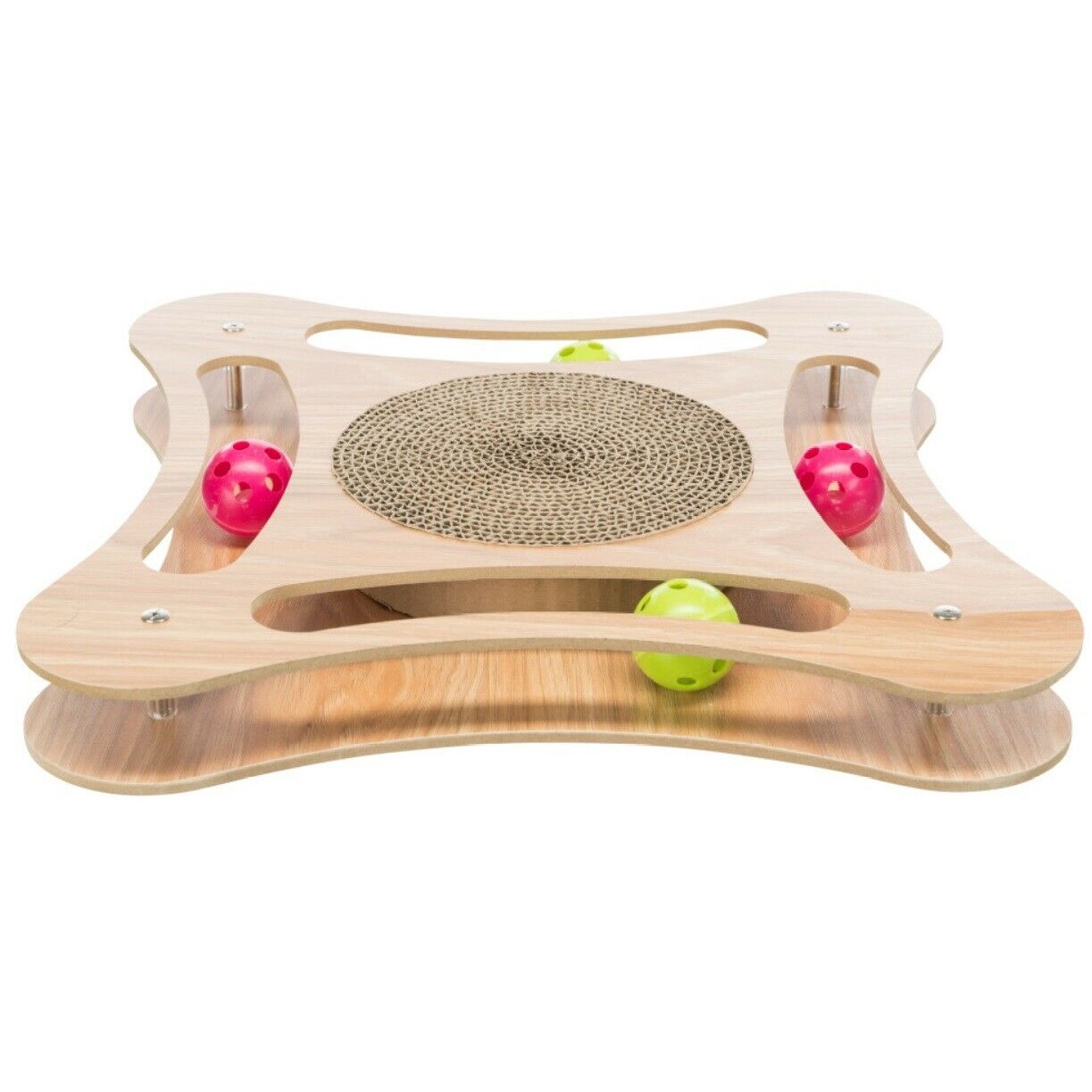Robust katteleke med klorebrett laget av slitesterk MDF og integrerte plastlekekuler. Holder katten aktiv og underholdt med både kloring og lek. Kompakt størrelse 35 x 4 x 35 cm, enkel å plassere i hjemmet. Lekekulene kan enkelt byttes ut for variasjon og langvarig moro.