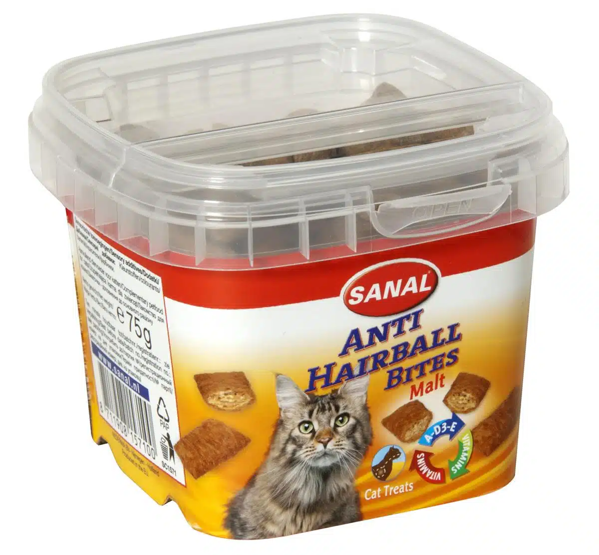 Anti-hairball godbiter som Sanal Cat Anti-Hairball Bites bør brukes som en del av en helhetlig strategi mot hårballer: