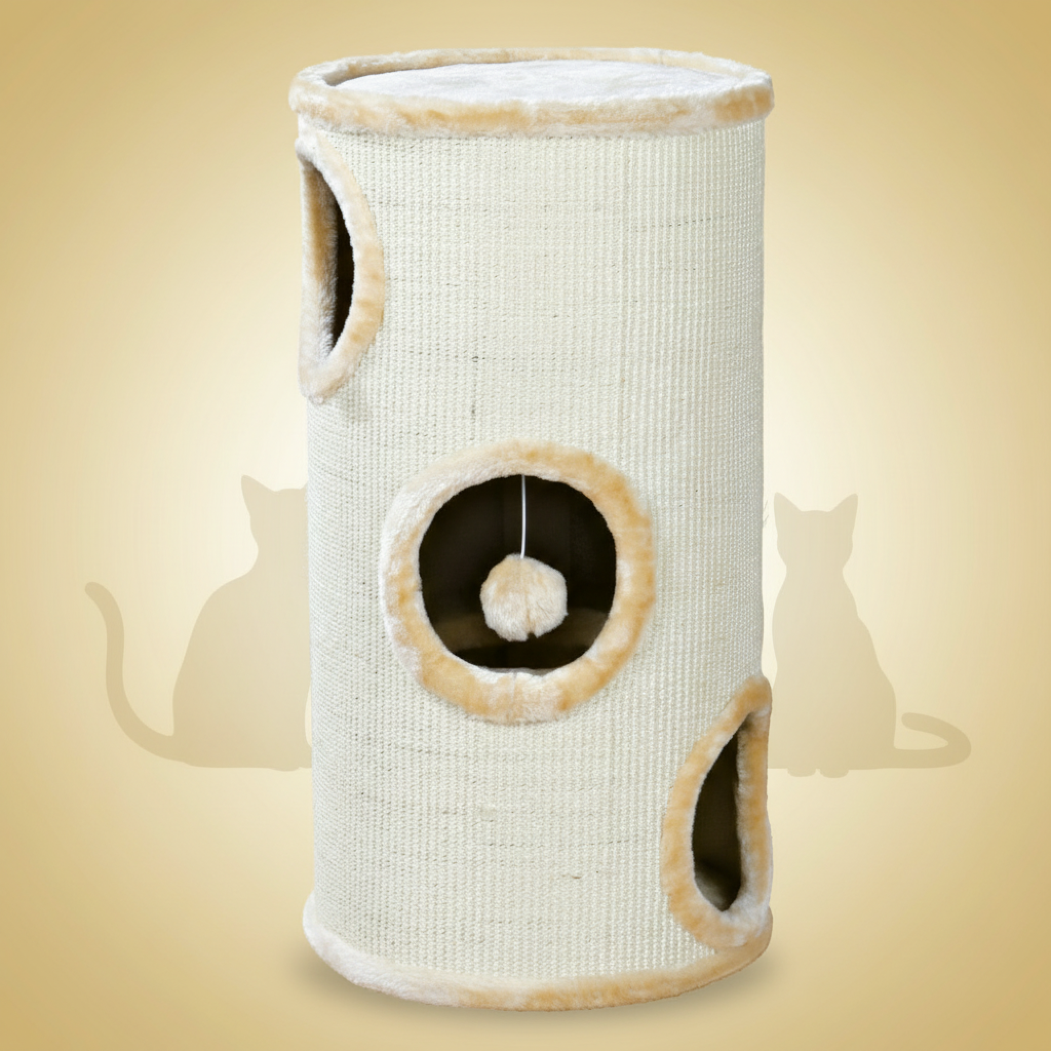 Robust kattemøbel med 3 etasjer, innebygd hule, sisal og plysj. 70 cm høyde. Stimulerer naturlig kloring, klatring og aktivitet. Beige farge, enkel vedlikehold.