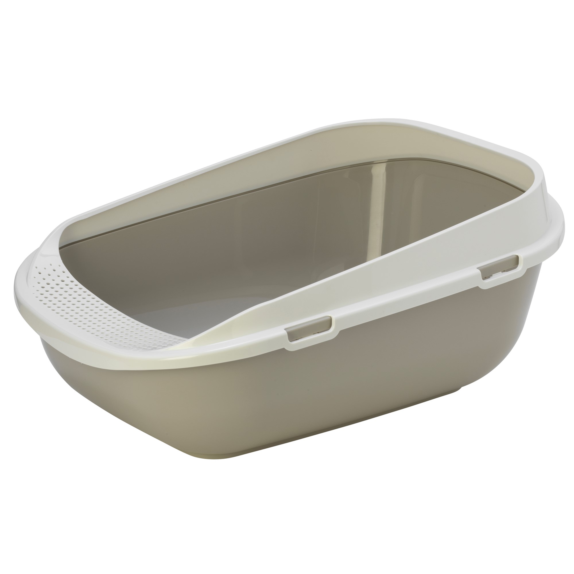 Den har et perforert inngangstrinn som holder søppel inne når katten din går ut av esken, og holder søppel på et minimum. Den høyryggede kanten sørger også for at søppel forblir inne i boksen. Den avtagbare kanten er enkel å ta av og erstatte ved å klikke den på plass igjen og kan rengjøres med varmt såpevann. Mega-Step er BPA-fri, ikke-giftig og laget av 100 % resirkulerbar førsteklasses plast.