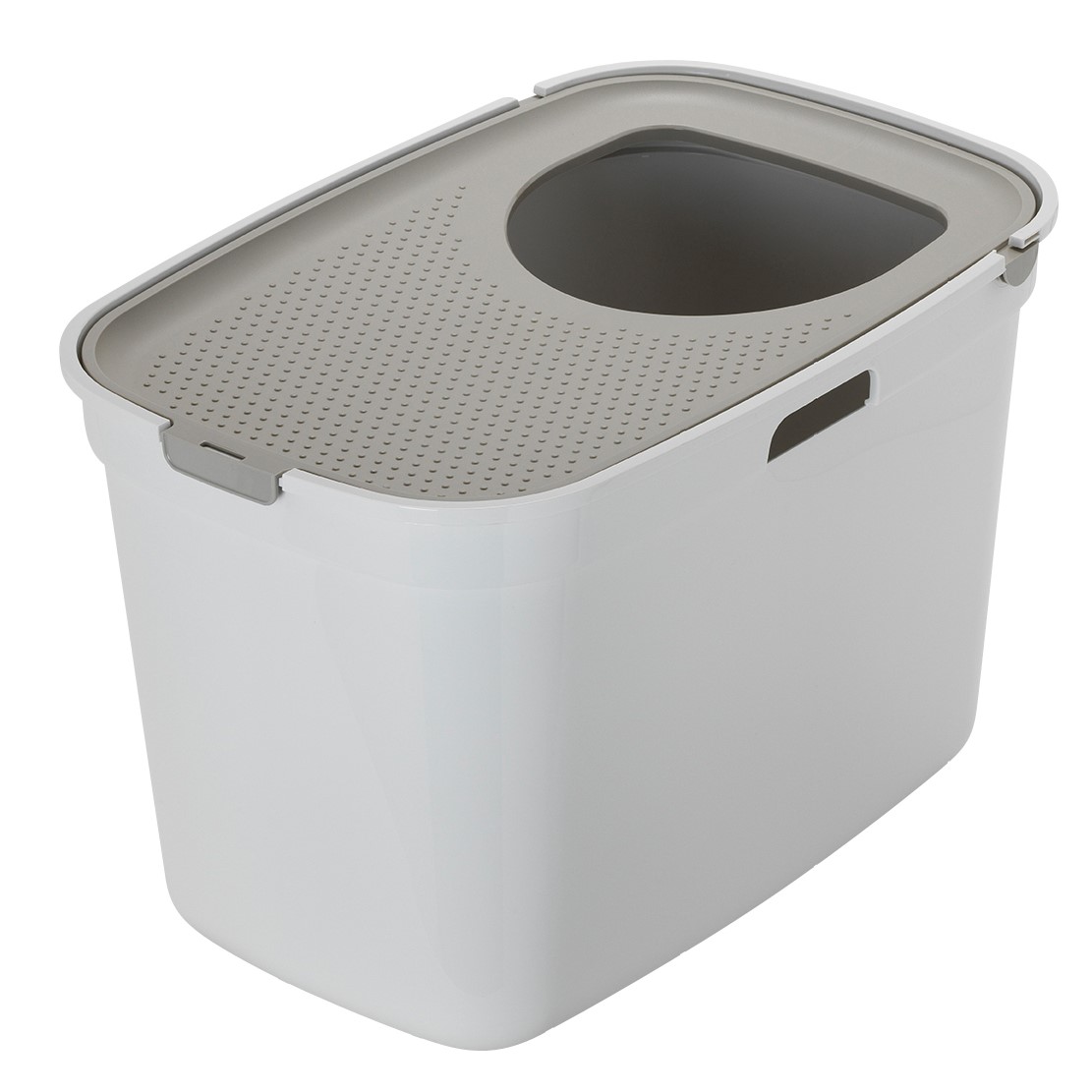 Visste du at ved å bare vippe lokket får du alt det gjenværende søppelet på lokket til å falle tilbake i boksen. Hvor praktisk høres det ut! Lokket fungerer dobbelt – det holder kattens toalettbesøk ute av syne, og det er også strukturert for å fange sølt søppel når kattungen din hopper ut. Basen har sømløse høye sider som unngår all mulig lekkasje.