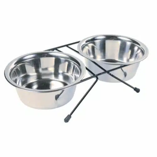 Dette praktiske og holdbare settet består av to rustfrie stål skåler montert på et svart metall stativ med pulverlakk for ekstra slitestyrke. Stativet har anti skli gummiføtter som sikrer stabilitet og hindrer at de glir under bruk.