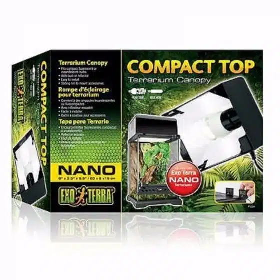Exo Terra Compact Top Canopy er en kompakt fluorescerende terrariumkalesje designet for bruk med Exo Terra Glass Terrarium. Denne lettmonterte lysrampen har plass til èn pære med lav watt.