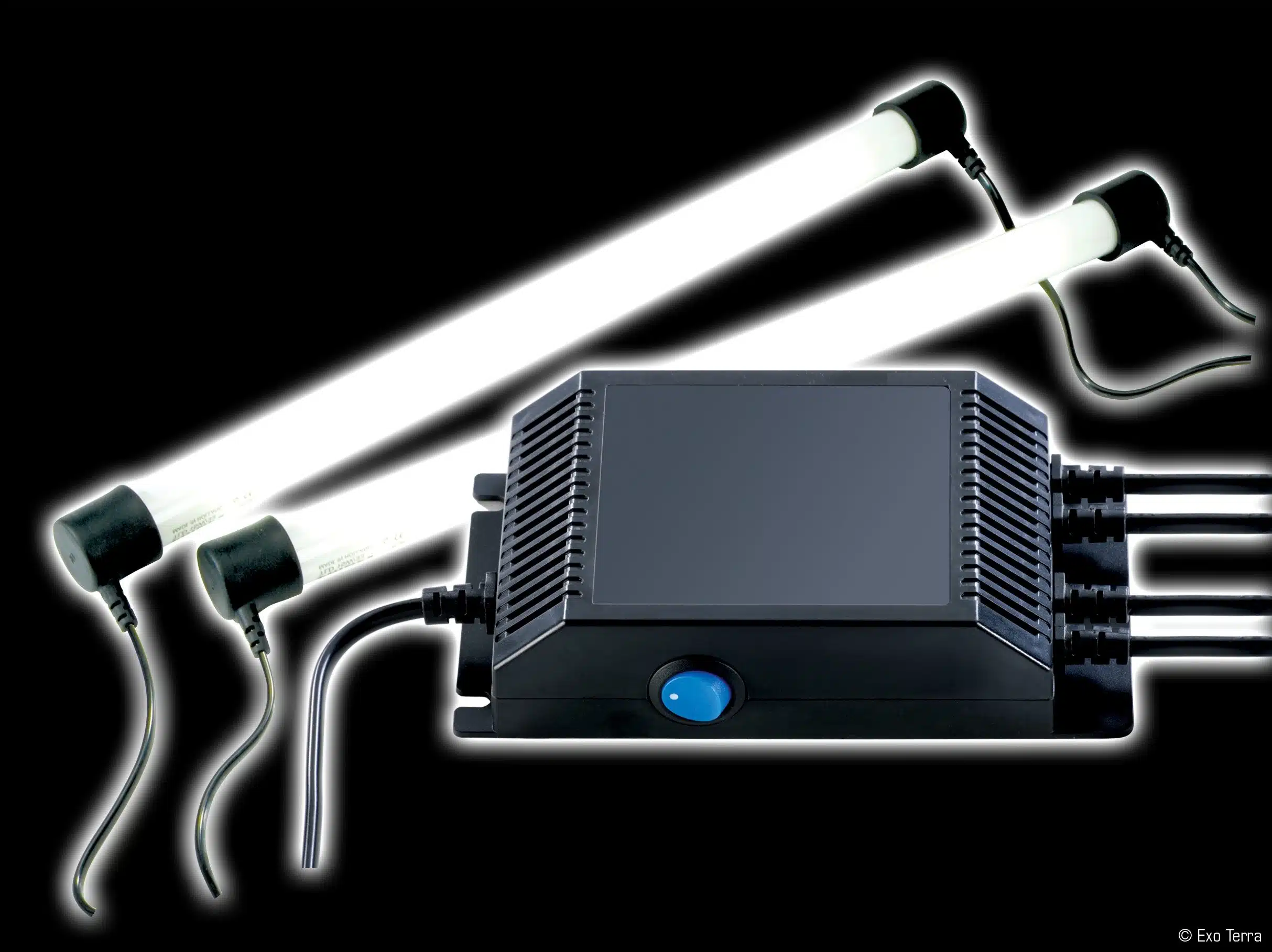 Exo Terra Light Unit gir fleksibel belysningsløsning for terrariet. Bare monter det elektroniske ballasthuset nær terrariet, og koble lysstofflampene til de vanntette endehettene. De lange, fleksible endekapsledningene gir deg mulighet til å plassere fluorescerende pærer svært nær dyrene, som er nødvendige når UVB-pærer brukes. De lange endekapsledningene gir også allsidigheten til å montere lysrør over alle typer terrarium, uansett størrelse.