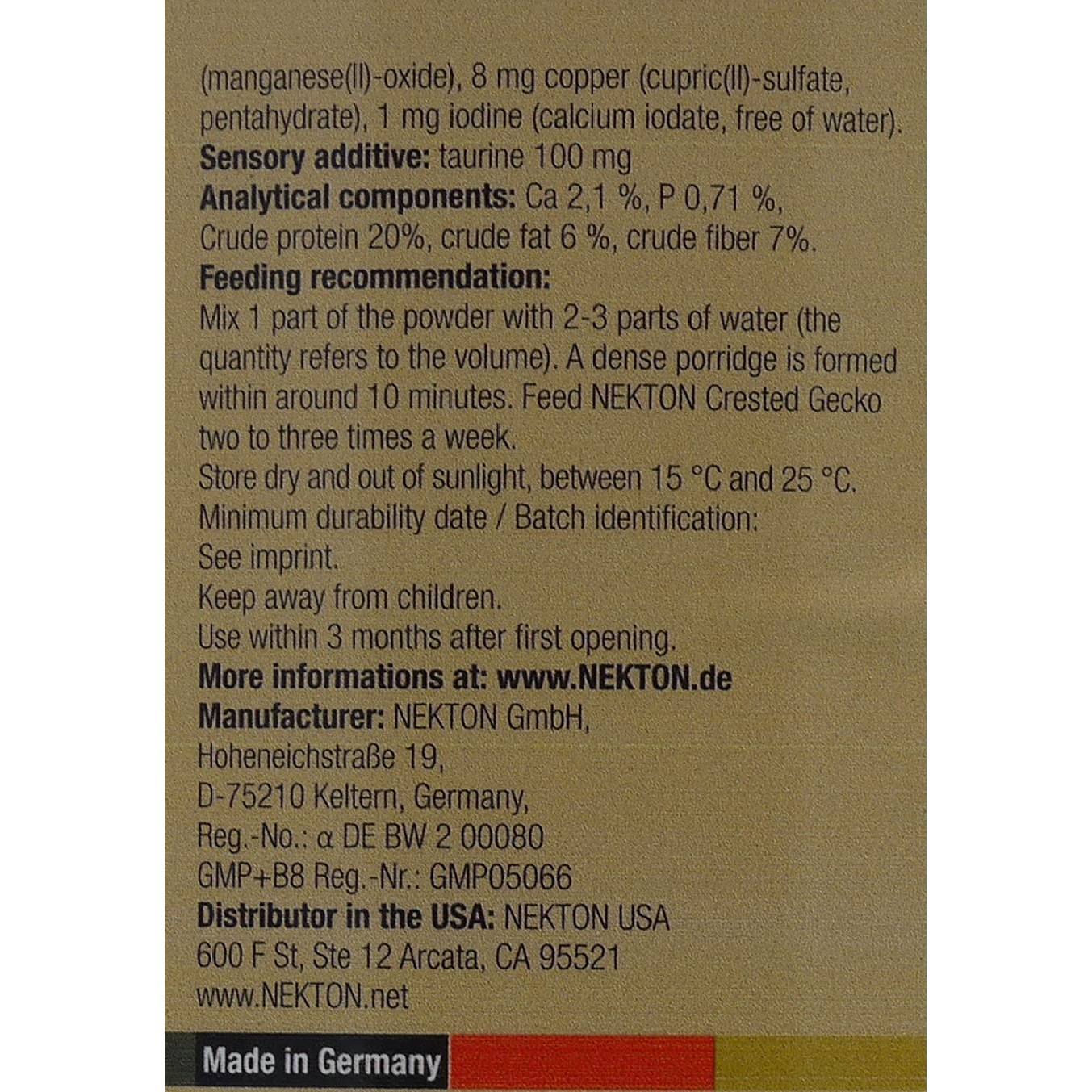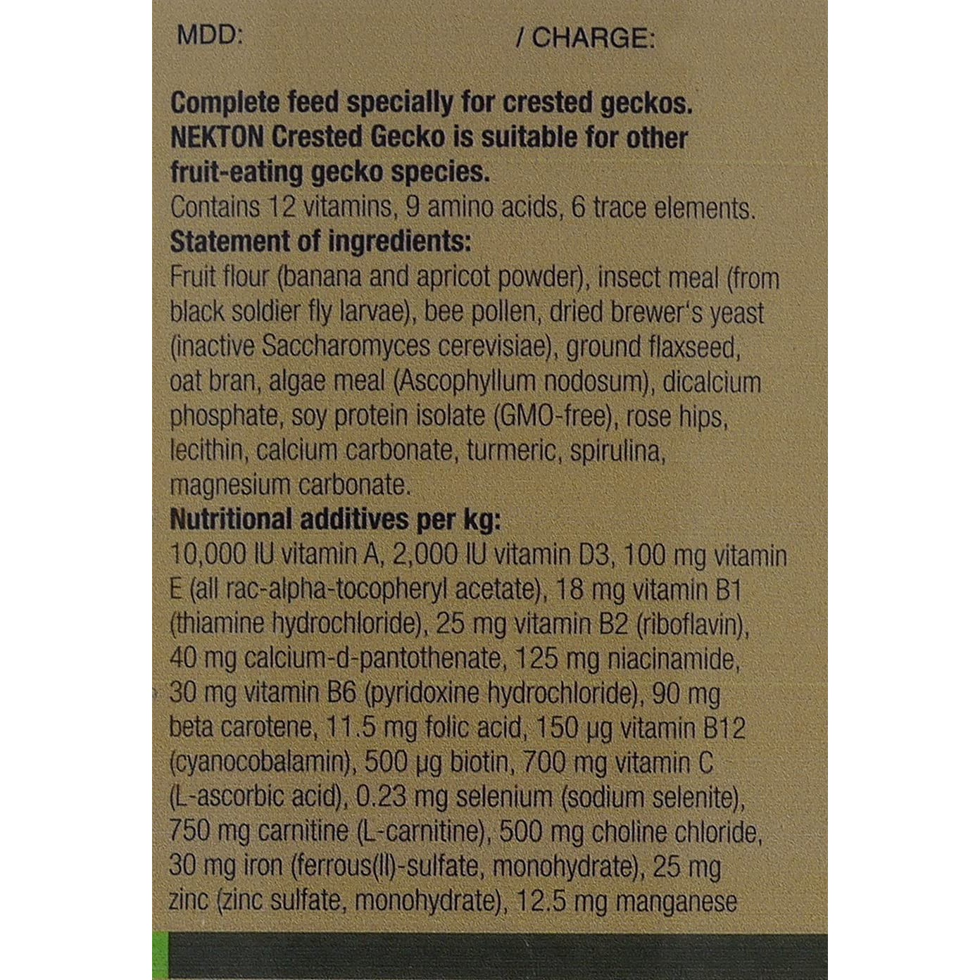 Ved fôring må det utvises ekstra forsiktighet for å sikre at kransetgekkoen er tilstrekkelig forsynt med essensielle mikronæringsstoffer. NEKTON Crested Gecko inneholder 12 vitaminer, 9 aminosyrer og 6 sporstoffer. Produktet har også et balansert kalsium-fosfor-forhold, noe som er spesielt viktig for helsen til krongekkoene.