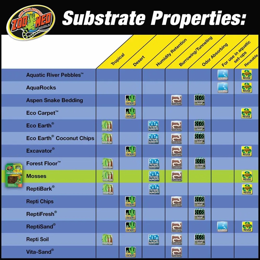 Den myke og naturlige strukturen gjør dette til et ideelt substrat som dyr kan grave i, hvile på og føle seg trygge i. Mosen etterligner de naturlige miljøene mange reptiler og amfibier kommer fra.